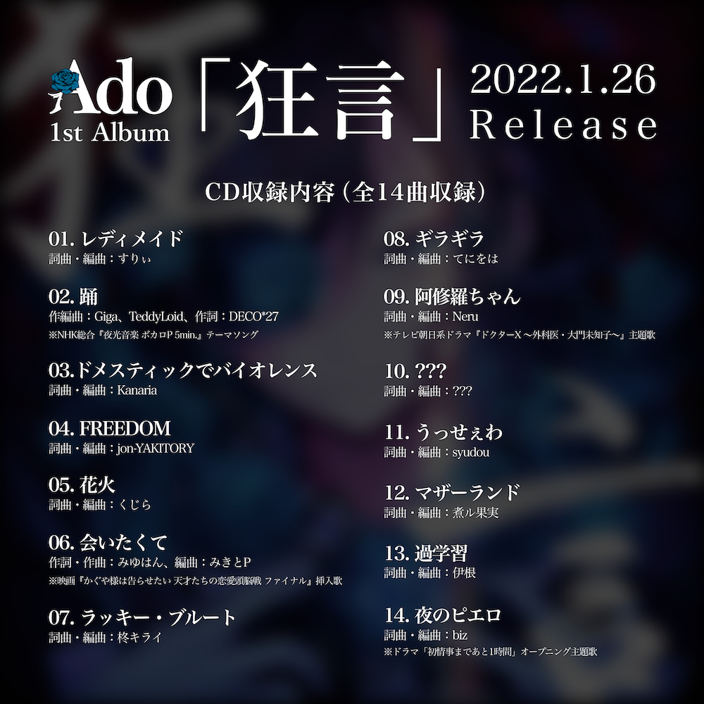 19歳の歌い手・Adoが2022年1月26日に発売する1st Album『狂言』に新録される6曲分の楽曲提供ボカロPの発表企画をTwitter上で12月20日から25日にかけて実施。
