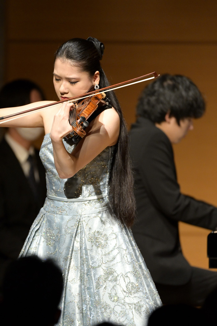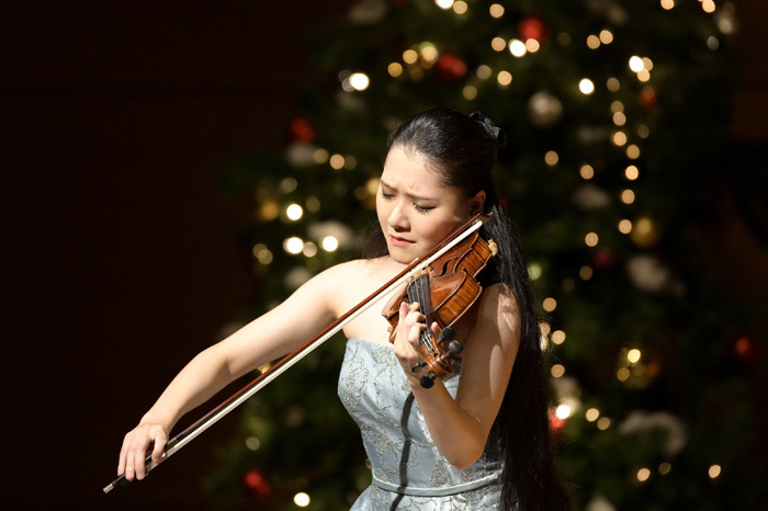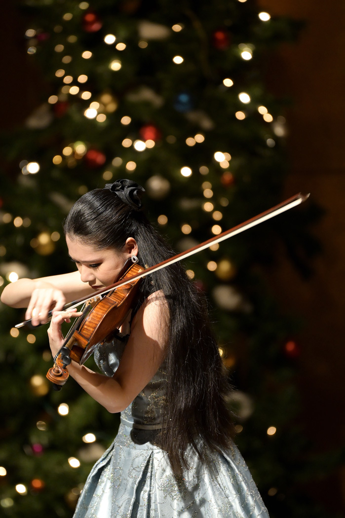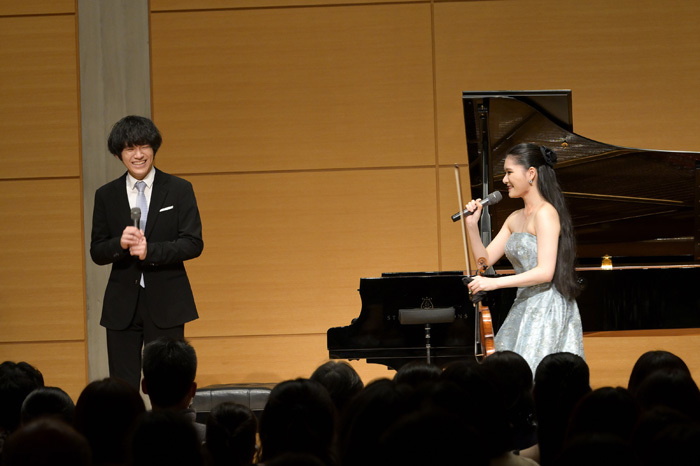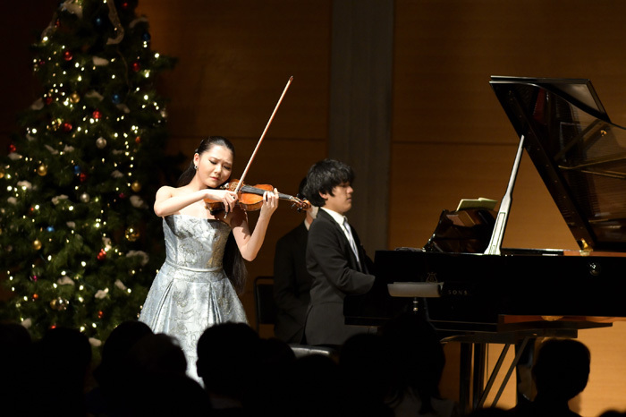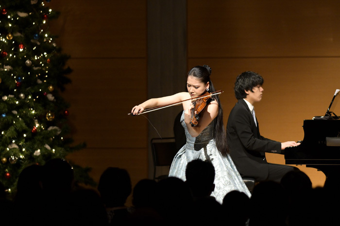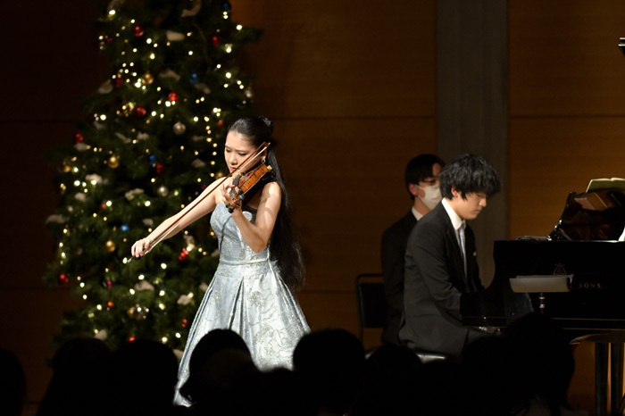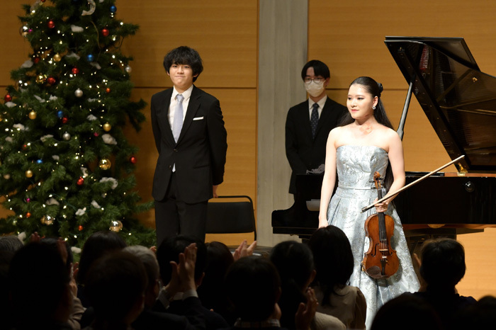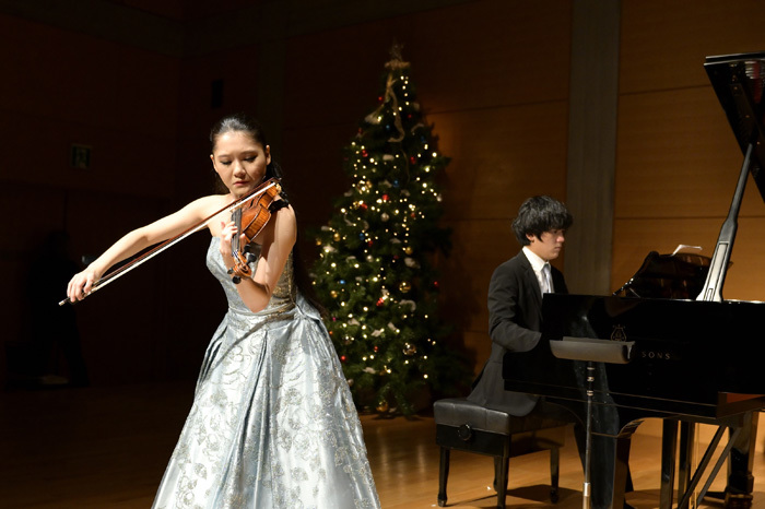 12月9日(木)、当夜は服部百音&亀井聖矢によるクリスマスコンサート連続二夜の二回目公演だ。少しブルーがかった美しいシルバーのドレスで登場した服部。そして、スーツでカッコよく決めた亀井。出だしから、ともに落ち着いた立ち振る舞いで客席に丁寧にお辞儀し、拍手に応える。服部も亀井も20歳前後の年齢で、亀井はまだ大学在学中という若さだが、一般的な同世代の若者たちよりもはるかに大人っぽくもあり、ともすると、むしろ茶目っ気たっぷりのやんちゃなティーンエイジャーの一面も持ち合わせるという、両面的な魅力を兼ね備えているのがこの二人の共通点だ。