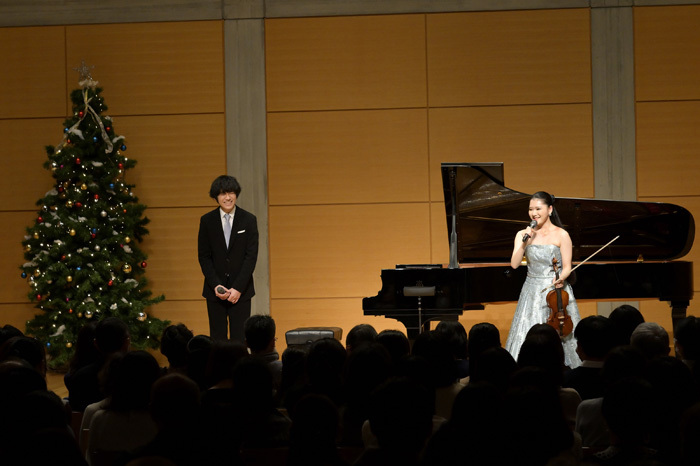 続いて、フランクの「ヴァイオリンソナタ イ長調」。「本当はここら辺でプロコフィエフのソナタあたりを弾きたいところなのですが、そこはクリスマスコンサートらしく、ほのぼのとした作品にしてみました」と服部。続いて、「デュオとしてピアノの比重がとても大きい曲ですし、一回出てきた旋律がまた別の楽章で違うかたちで現れたりという面白さもあります。ほのぼのと言っても、幸せなひと時が感じられるのは一楽章だけですね」と亀井。この大曲について、演奏前にそれぞれの視点から思うところを語っていたのが興味深かった。