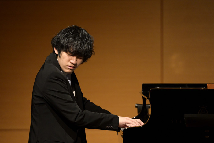 一曲目は当初、後半に予定されていたシマノフスキの「ノクターンとタランテラ」。いきなり冒頭から限りなく近代の響きに近い妖艶な旋律から始まった。ジプシー的でエキゾチックなメロディとシマノフスキ特有の浮遊するような旋律を服部はいとも軽やかに、しかし、その内に潜むデモーニッシュな表情を見事に捉える。亀井のピアノも寄り添うようにピタッとリズムを刻み、この妖艶な世界観にふさわしい完璧な色彩感を与えていた。