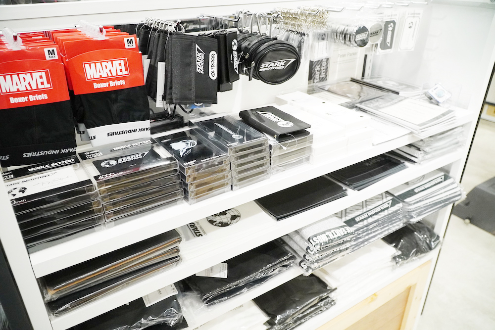 『Disney+(ディズニープラス)』で配信中のマーベル・スタジオが贈るドラマシリーズ『ロキ』のグッズコーナーには、TVAやミス・ミニッツをモチーフにしたTシャツや帽子、カップなど。スターク・インダストリーズ(STARK INDUSTRIES)は、メモ帳やマウスパッド、クリアファイルなど実用的なものも多く、なんだかスターク・インダストリーズの社員になった気分だ。
