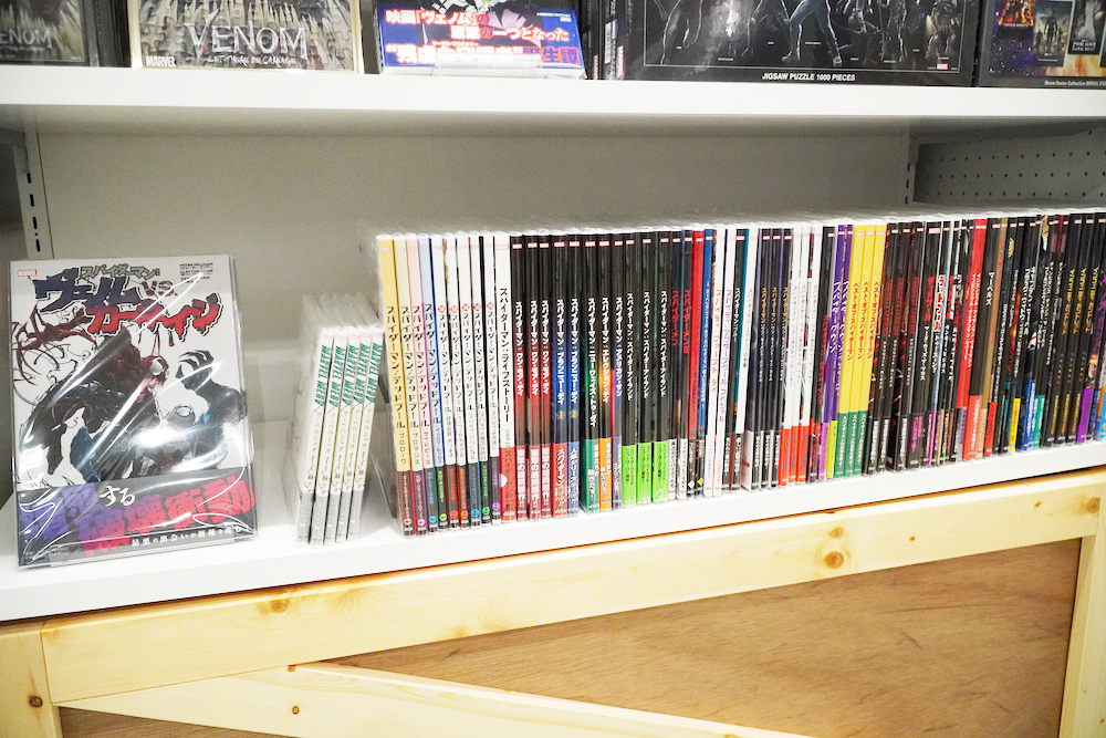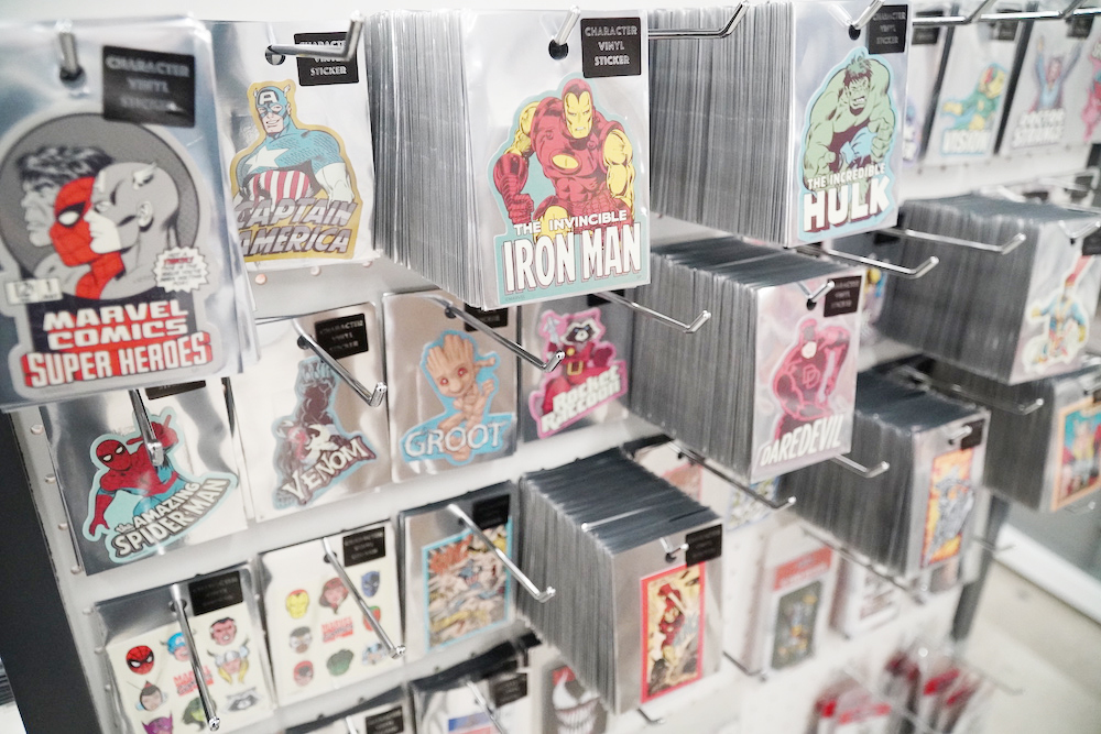 コミックスタッチのイラストで描かれたステッカーもずらり。もちろん原作コミックス(日本語訳)も取り扱っている。買い物をしている途中に、改めて原作を読んでみたいな……と思ったときに、気軽に手に取れるのも嬉しい。