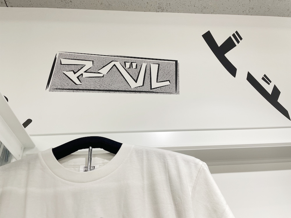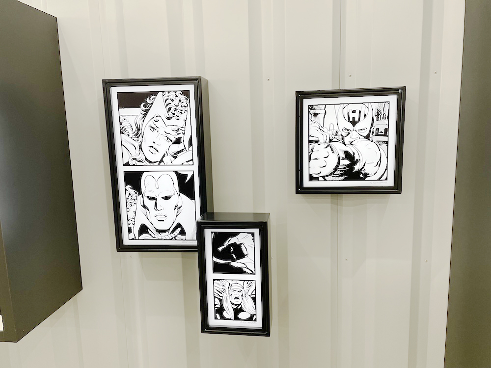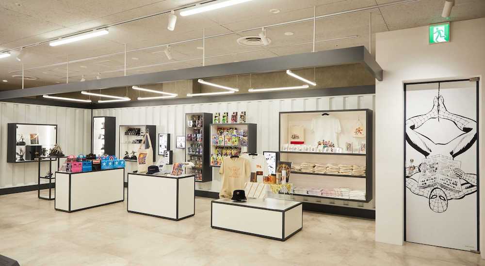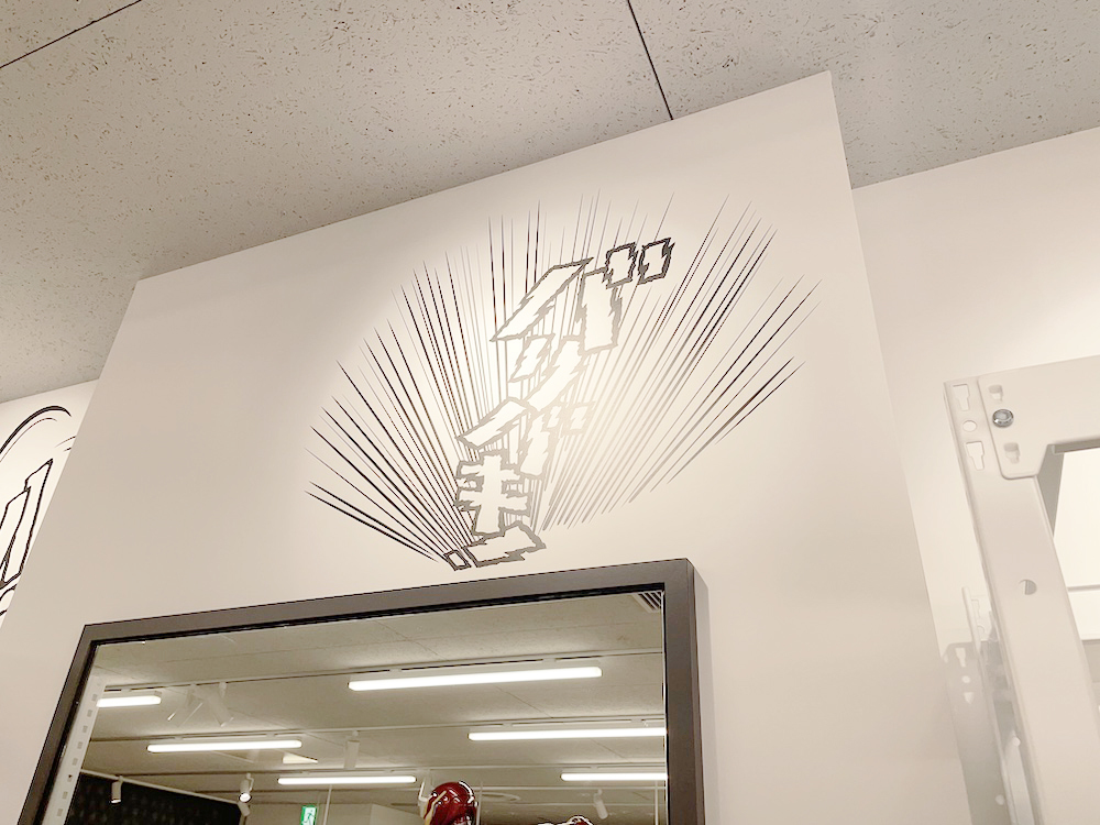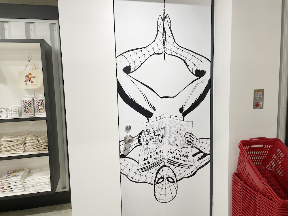 マーベルのルーツを辿ると『MARVEL COMICS』というコミック誌に行き着く。本ストアはそのコミックスに原点を置き、ストアを通してマーベルのルーツを表現したいという思いで店内のデザインをしたのだという。モノクロに統一された店内の壁面には、天井から吊り下がったスパイダーマン、キャプテン・アメリカやファルコンなど、実際のコミックスアート素材が使用されている。また、「バリバキ!」「ドドドドド」など、日本語の擬音が壁に描かれているのがなんとも面白い。