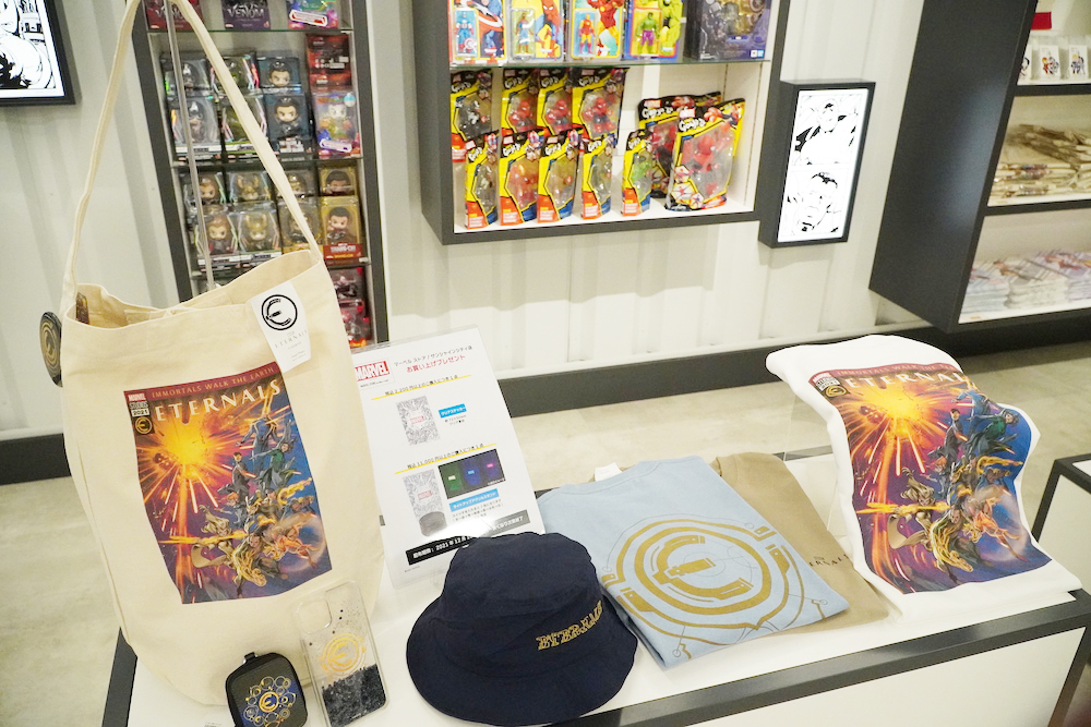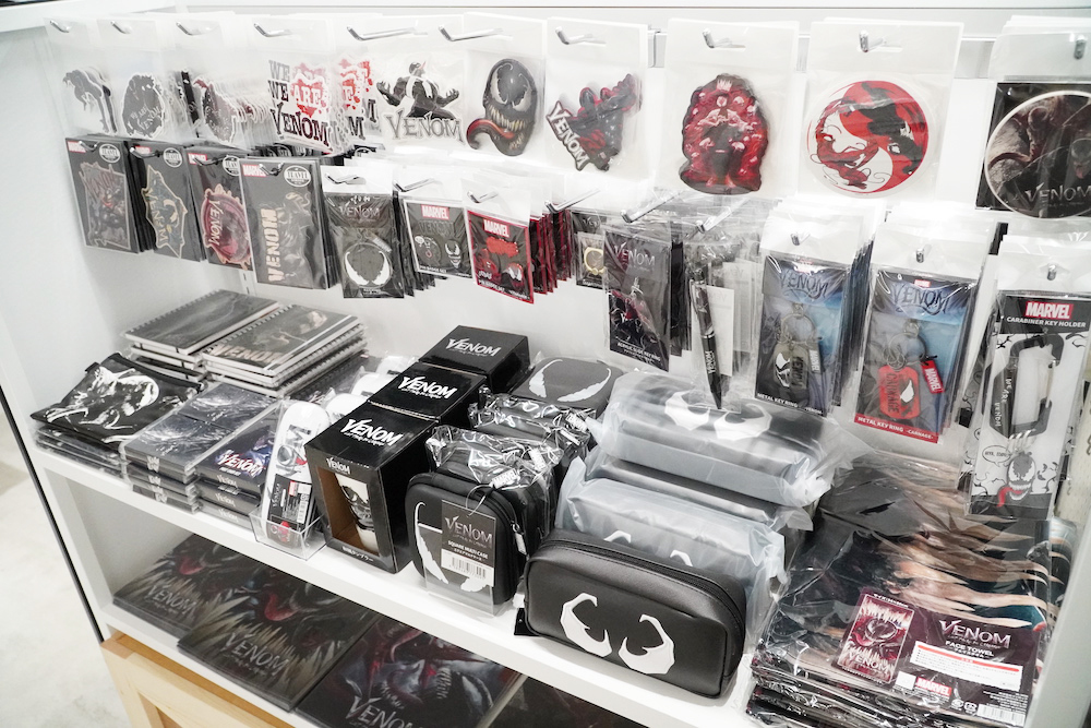 店内デザインだけでも十分にマーベルファンの心を掴むのだが、ショップに陳列された商品を見ると、より一層テンションが上がってしまう。本ショップでは店舗限定の商品だけでなく、映画公開に合わせてオリジナルアイテムをセレクトするそうで、ここだけしかない・その時期にしか見られないグッズも多数取り揃えるそうだ。内覧会時は『エターナルズ』、『ヴェノム:レット・ゼア・ビー・カーネイジ』が上映中だったため、2作のアイテムが充実した品揃えを見せていた。