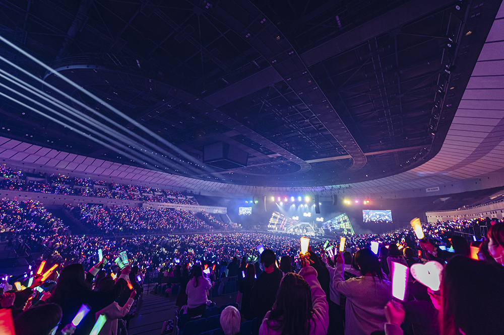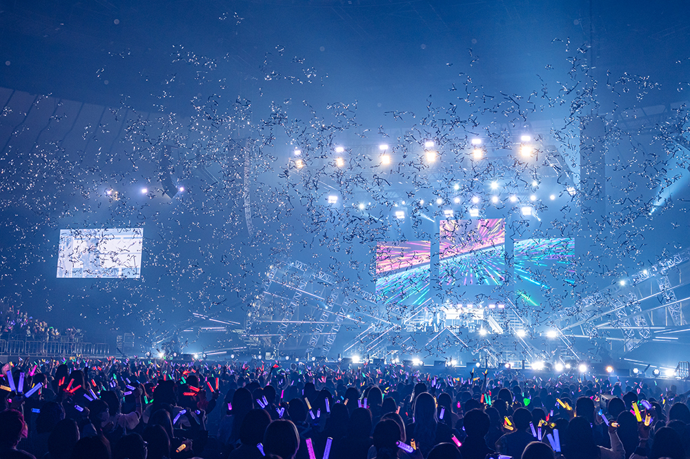 カウントダウンでオーディエンスの期待感が煽られる中、ステージ上段のスクリーンが上がると、そこには6人の姿が。「横浜アリーナ、いくぞ!」と気勢をあげた1曲目は、「トップシークレット」だ。前回の横浜アリーナ公演で時間的に披露することができなかった「トップシークレット」を、いきなり頭に持ってくるとは! バンドサウンドにがっちり支えられながら、それぞれに鮮やかな色を放つ歌声をつないで重ねて、個々のメンバーカラーを配したマントを翻しながらダンスしていく6人。歌にもダンスにも、3か月でますます磨きがかかったことがよくわかる。