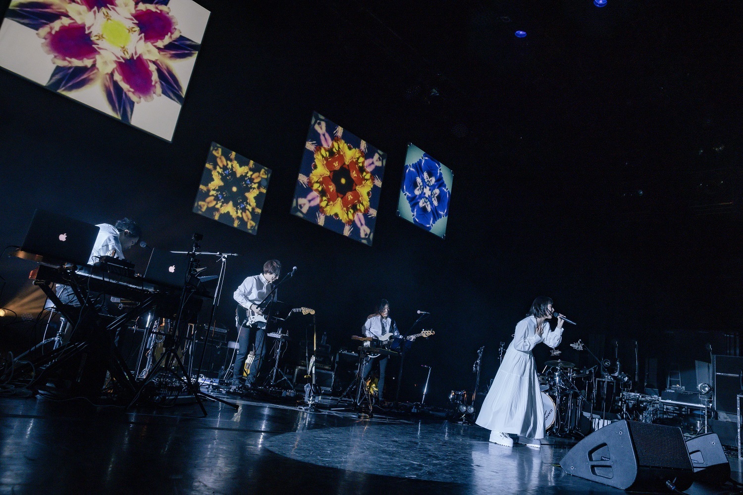 一曲目を終えると改めて挨拶。「好きなように身体を動かして楽しんでもらえばと思いますので」と今回のライブについて説明すると、「楽しむ準備はできていますか!?」との曲振りからキーボードが力強いメロディを奏でる。ステージ後方にある大小異なる4面のスクリーンは印象的な白黒映像で花を映し出し、歌声がそこに合流する。二曲目に披露したのは「ハミダシモノ」。