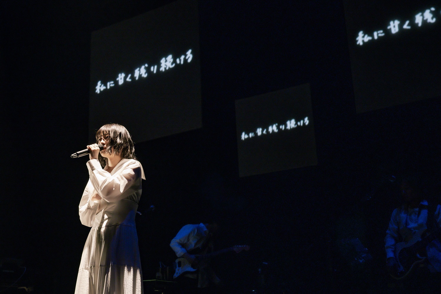 ステージの端にあるセットに、そっと腰掛けると続いてのナンバー「よりみち」。ローファイなサウンドが会場を包み込むと、座ったまま語りかけるように歌い始める。そして、時に舞台上をゆらゆらと歩き、「よりみち」をしながら口ずさむかのように曲を紡ぐ。スクリーンにはリリックビデオのイラストの断片が映し出される。ただ歌を届けているのではない。彼女が届けたかったのは情景なんだ、それに気づかされて膝を打たされた。