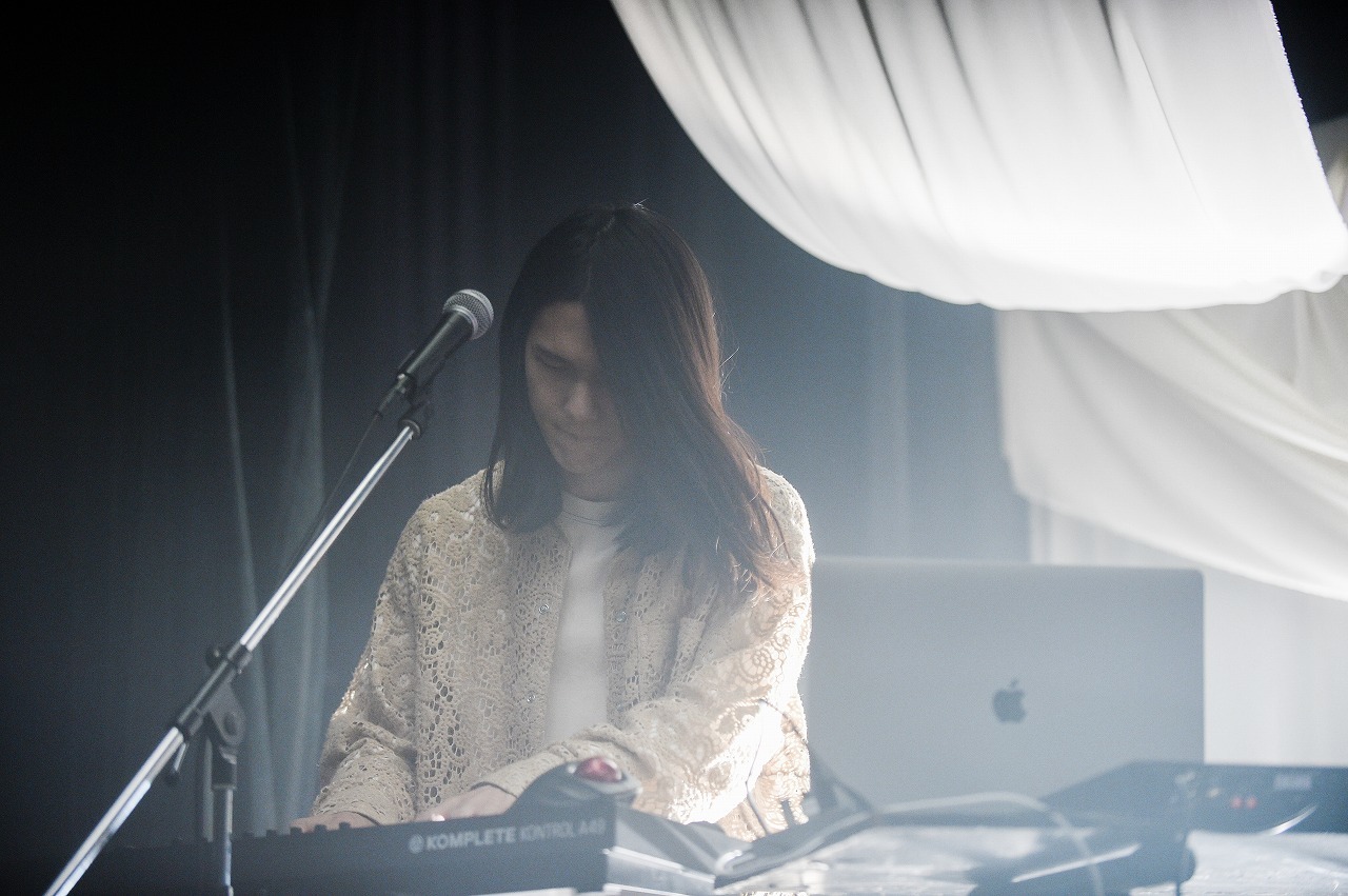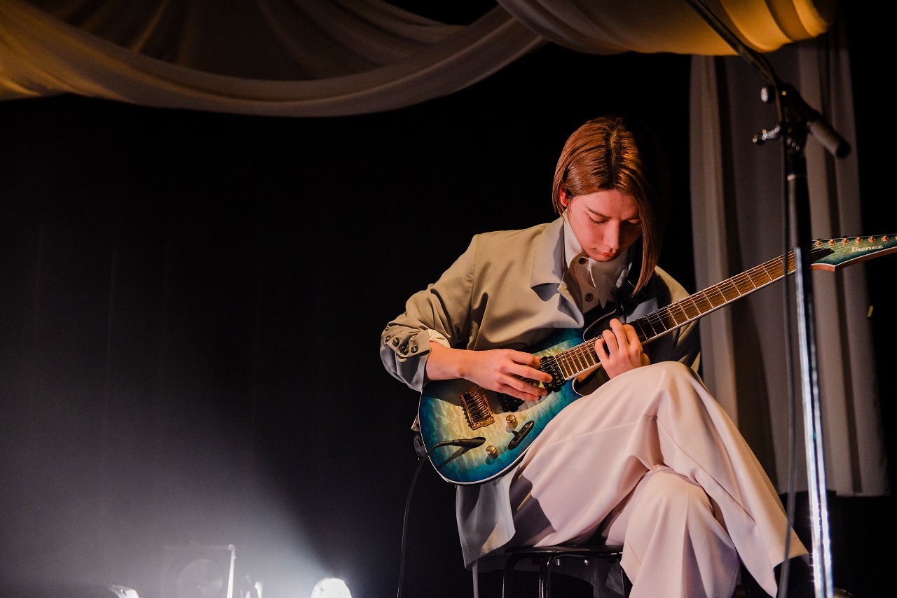 もともとはIchikaの曲にたなかが歌詞を乗せたという「Misery」は、クールなヒップホップトラックとミニマルなギターリフの繰り返しに、激情を抑制したたなかのボーカルがそっと寄り添う。逆に「ダークルーム」は、流れるような指使いのギターから始まり、じわじわとロック的な熱情を帯びてゆく曲で、歌詞に込めた極端に内省的な衝動と、毒々しく真っ赤に染まったライティングがよく似合う。つらいことばかりの現実から逃げ出し、ダークルームに閉じこもった二人の結末は? 怖さと美しさが相半ばする、たなかの世界観が色濃く出た1曲だ。