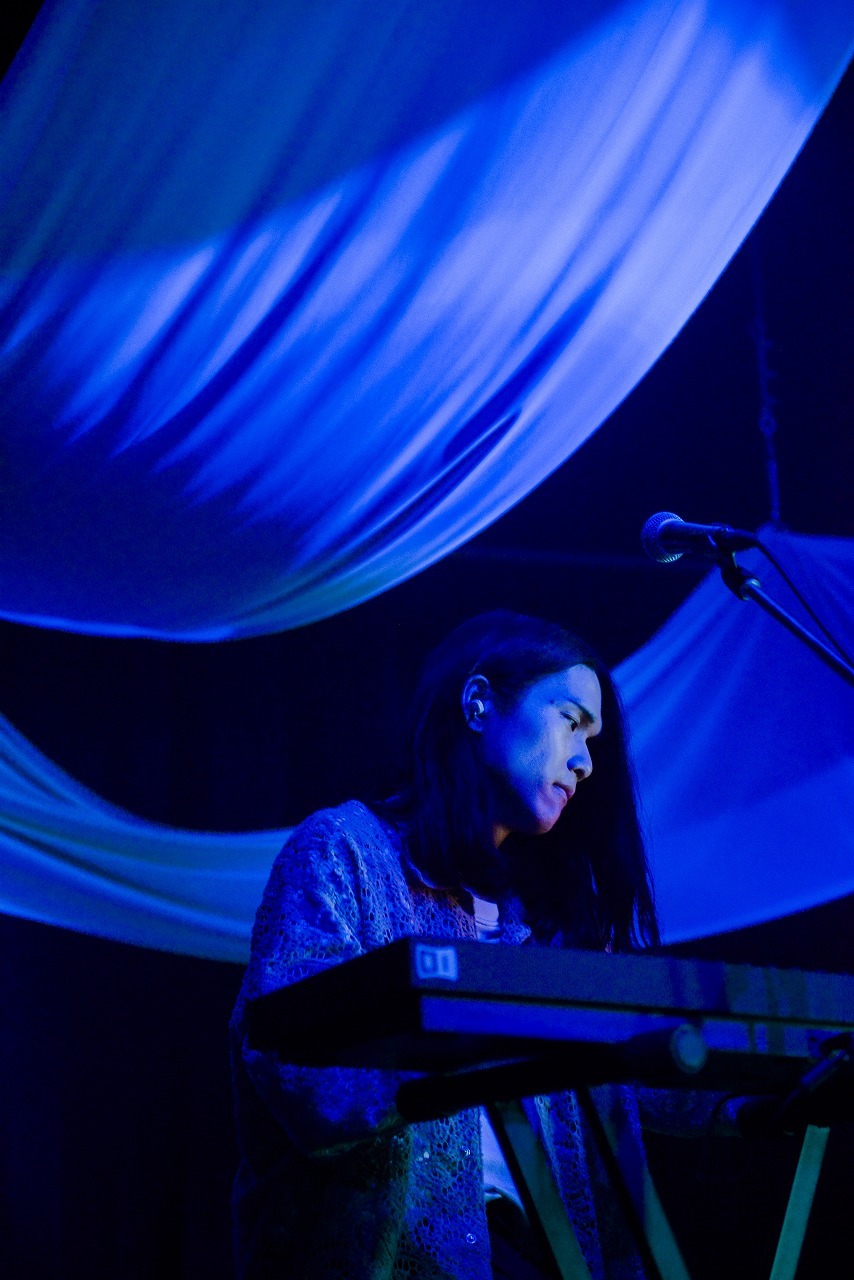 ピアノとギターで紡ぐ広がりある空間の中で、たなかが意味を持たない自由奔放なスキャットを披露するインプロビゼーション音楽に続き、Ichikaの強烈な歪みギターが導く「いのち」へとつなげる、あまりにも濃密でスムーズな流れに、オーディエンスはただ体を揺らして音の海に浸るのみ。ファルセット音域を駆使した演劇的なたなかの歌は、続く「鬼よ」でも強いインパクトを持って迫り来る。激しい身振り手振りを交えたパフォーマンスからも目が離せない。Diosの持つ実験性やアート性が存分に発揮された、極めて緊張度の高い音楽だ。