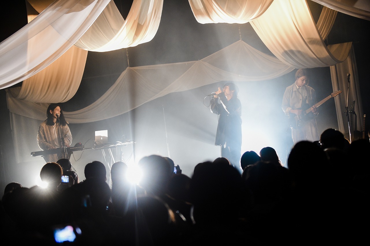 「リリースが5曲しかないのによくワンマンライブをやろうと思ったよね」と、Ichikaが笑う。「今日のライブは短いけど、頑張ってアルバム作ってます」と、たなかが応える。「3人でああだこうだ作っていくと本当にいい形になるよね」と、ササノが言う。バンドは音楽性と人間性とが絡み合い成長していくものだが、この3人は実に“合ってる”。「一人の時より楽しくて、(ステージに)出る前も不安じゃない」とたなかが笑う。3年前、ぼくりりの活動終了直前にこの会場で見た彼の姿をふと思い出す。あの時とはまったく違う、肯定的な空気がステージから流れ出して見える。