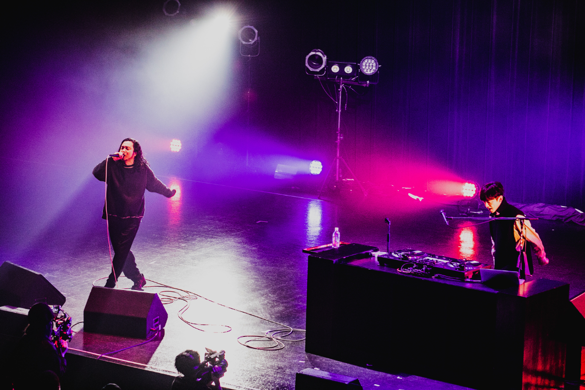 「大先輩に何で対抗するか? DJとラップの腕前……俺らの武器で対抗するしかないんですよね」と語ると、「顔役」を皮切りにキレキレのラップとビートを畳み掛けるR-指定とDJ松永。ウッドベースとスクラッチが絡み合う「かつて天才だった俺たちへ」が鳴り響くと、場内はもはやワンマンライブ級の盛り上がりだ。