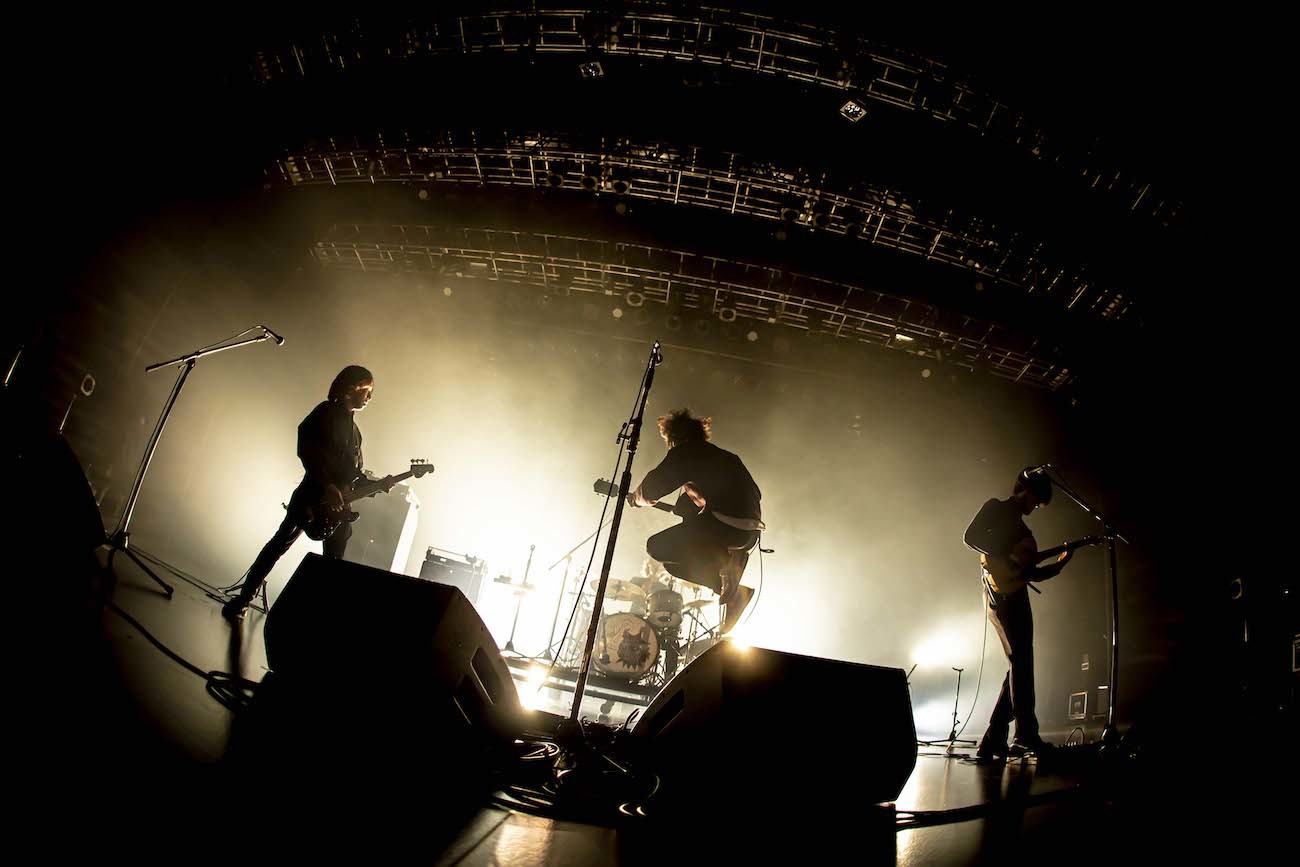 「どうも。僕たち京都のバンド、夜の本気ダンスです」という米田貴紀(Vo/Gt)のあいさつを皮切りに、「Ain't no magic」から、夜の本気ダンスのライブが幕を開けた。足をクロスする独特のプレイスタイルで執拗にループする西田一紀(Gt)のギター。推進力のある低音でボトムを支えるマイケル(Ba)のベースに、脇を締め、タイトに刻まれる鈴鹿のドラム。まずは怪しげなグルーヴでフロアのお客さんをじんわりと揺らしていく。4つ打ちのリズムにポップなメロディが弾んだ「LOVE CONNECTION」がはじまると、一斉にお客さんがジャンプした。ボーカルも含めて全パートがリズム楽器として機能するような夜ダンのダンサブルなロックナンバーはじっと動かずに聴くことなんて不可能だ。