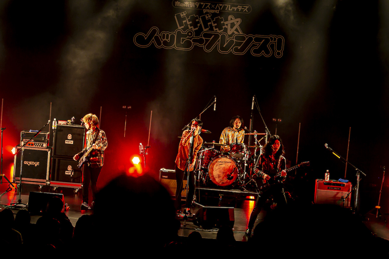 しいて言うなら、ライブバンドであること。日常生活のなかで抑圧された感情や心の中に渦巻き続ける得体の知れないモヤモヤを解放するためのロックを鳴らしていること。それがこの3組の共通点だと思った。夜の本気ダンスとハンブレッダーズがEX THEATER ROPPONGIで開催した初の共同企画イベント『ドキドキ☆ハッピーフレンズ!~クリスマス編~』だ。ゲストアーティストには2組に共通する友人として忘れらんねえよが出演。クリスマス間近ということで、余興としてプレゼント交換タイムも用意されたこの日は、世代もバンドのスタンスも異なる3組が、それぞれ自分たちが信じるロックンロールを鳴らし合う一夜限りのスペシャルなライブになった。