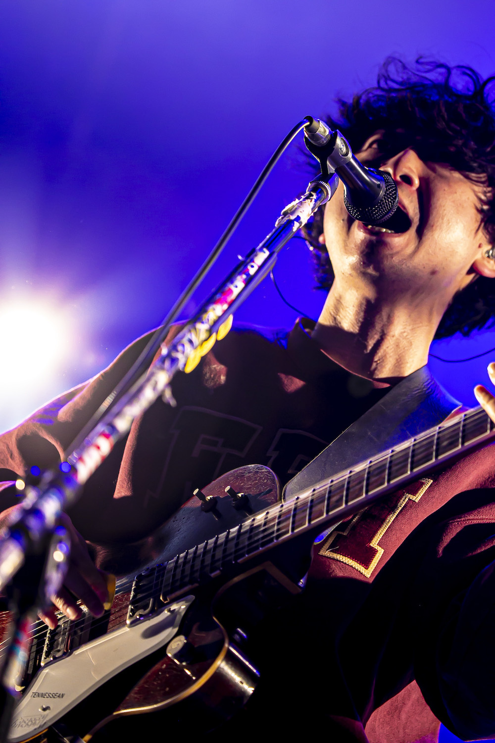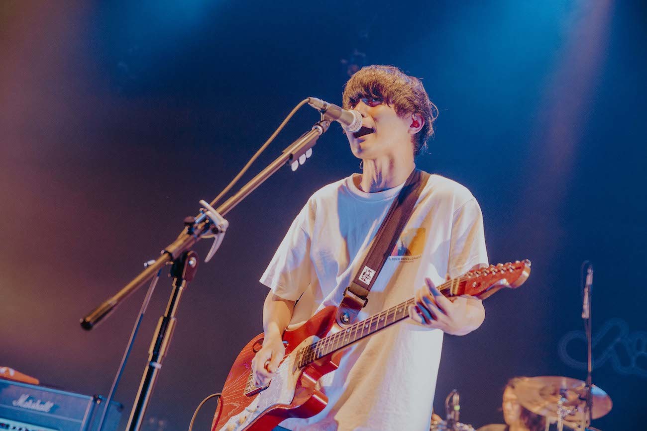 SEはアニメ『HUNTER×HUNTER』の初代OPとして有名なKenoの「おはよう。」……と言えば、続いての登場はハンブレッダーズだ。爽やかなグリーンの照明がステージを包み込むなか、4人が気持ちをひとつにするように集合してライブがはじまった。「クリスマスも変わらずロックンロールをやるだけです」。平熱のままの口調でムツムロが意気込みを伝えると、ベース・でらしがイントロで思いっきりジャンプをして「弱者の為の騒音を」を繰り出す。「青春を歌いにきました。大阪のハンブレッダーズです」。自己紹介は手短かに、11月にリリースしたばかりの最新アルバム『ギター』のタイトルトラック「ギター」では、ワン!ツー!スリー!フォー!のカウントを合図に、木島(Dr)がスティックをぶん回しながら軽やかなビートを叩き出し、そのうえをポップで人懐こいメロディが転がった。「俺はロックバンドがいちばんかっこいいと思ってここに立っている」という揺るぎない言葉を添えた「ユースレスマシン」では、ムツムロを中心にメンバー全員の合唱で歌う主旋律に、サポートギターうきによるメロディアスなフレーズが絡み合った。