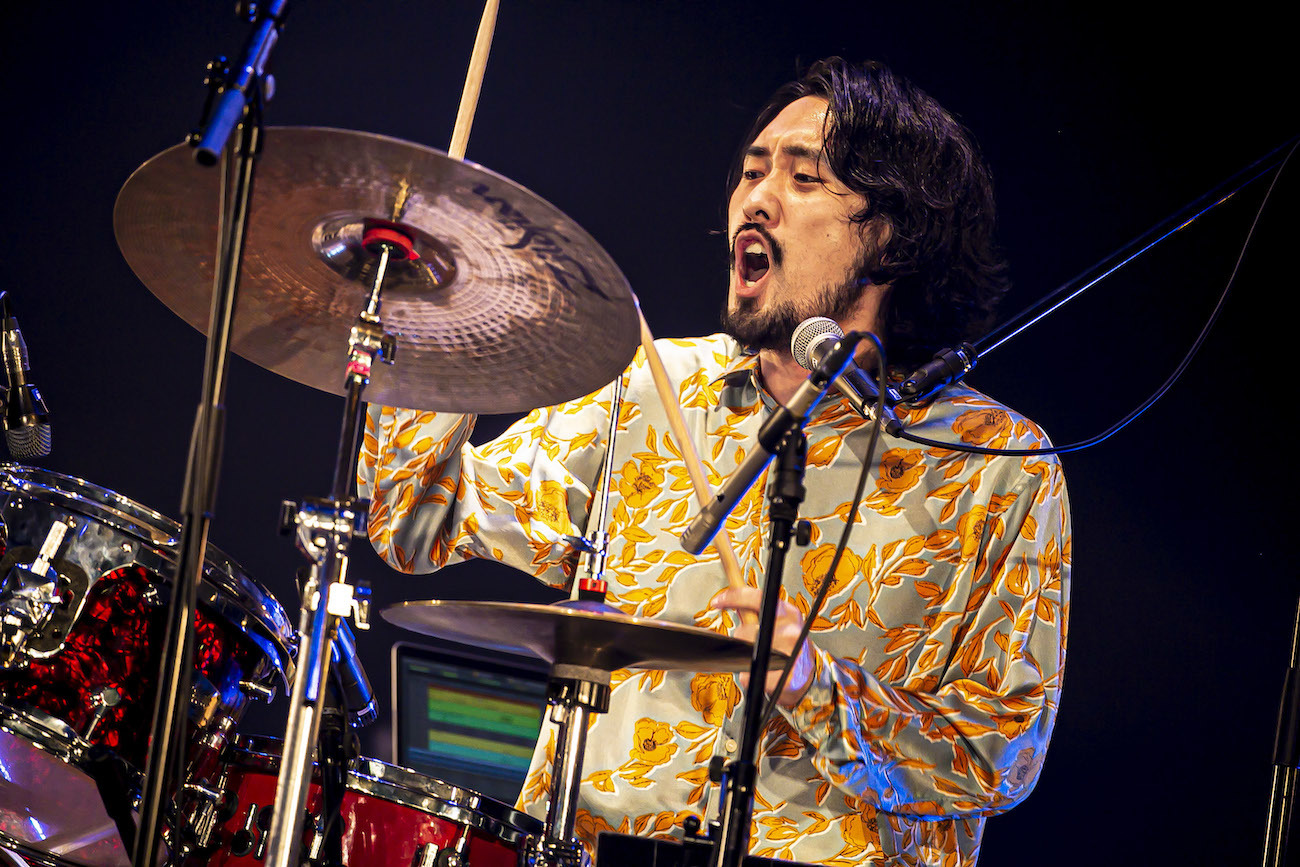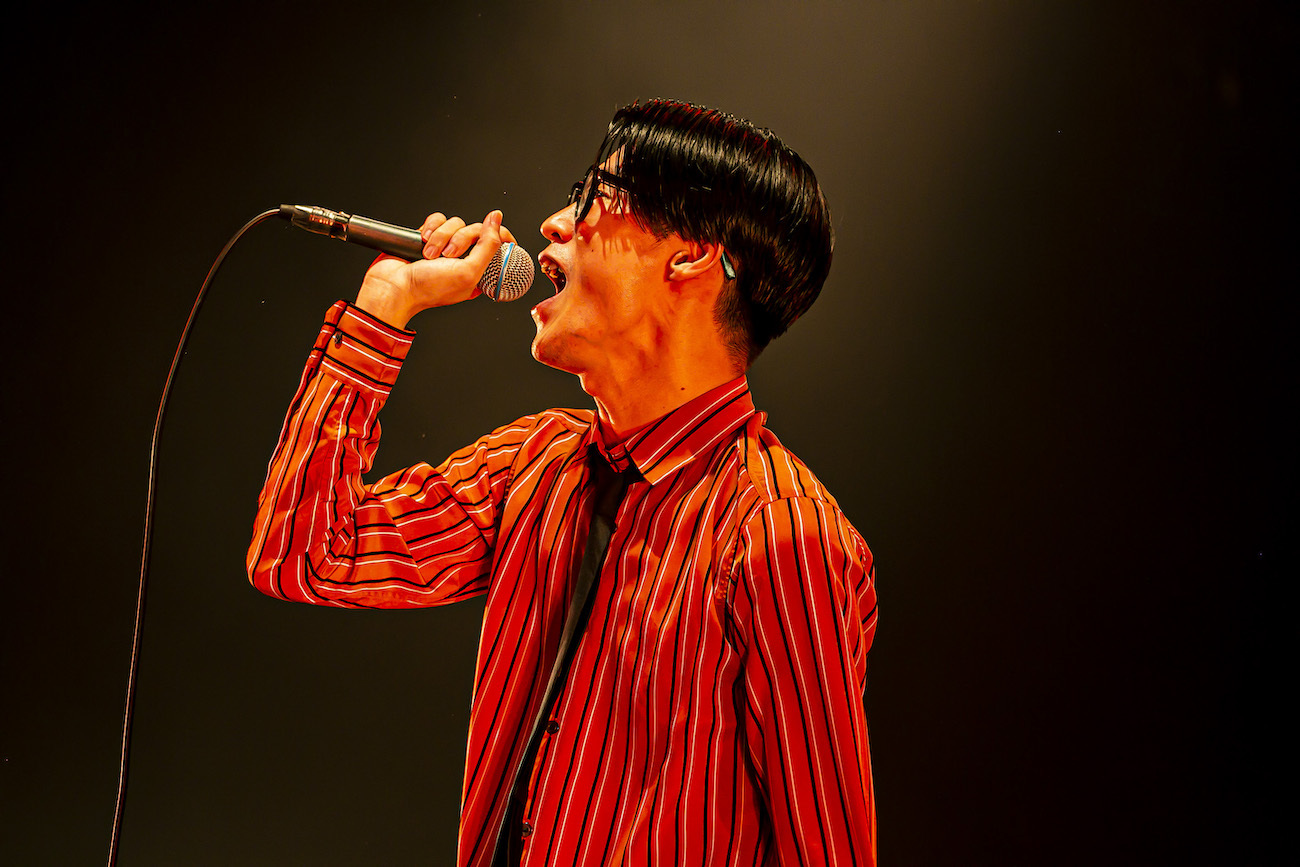 「Take it back」と「Movin'」をノンストップでつなぎ、さらにディープに突き進んだライブの中盤、「SMILE SMILE」で米田のボーカルがひときわ熱を帯びた。夜ダンの楽曲では珍しくメロディに重きを置いたアンサンブルのなかで、<燦々 輝くこの命><散々な日々には笑うといい>と紡がれるフレーズは、米田自身、命が輝いているとは思えなかった時期、笑えなかった時期に、自分に言い聞かせるように作った楽曲だ。「踊れるバンド」という強力なキャッチコピーゆえに見落とされがちだが、こういう楽曲に触れたとき、夜ダンもまたハンブレッダーズや忘れらんねえよと同じく、日常のなかで抱く満たされない感情を音に昇華するロックバンドなのだと思う。持ち時間の最後には、キレのあるスネアが駆け出すように突入した「WHERE?」でギアを一段あげ、「GIVE & TAKE」と「TAKE MY HAND」という強靭なダンスロックを立て続けに披露。会場を端から端まで踊らせる、夜の本気ダンスにしかできないやり方で最高潮のクライマックスを掴みとった。