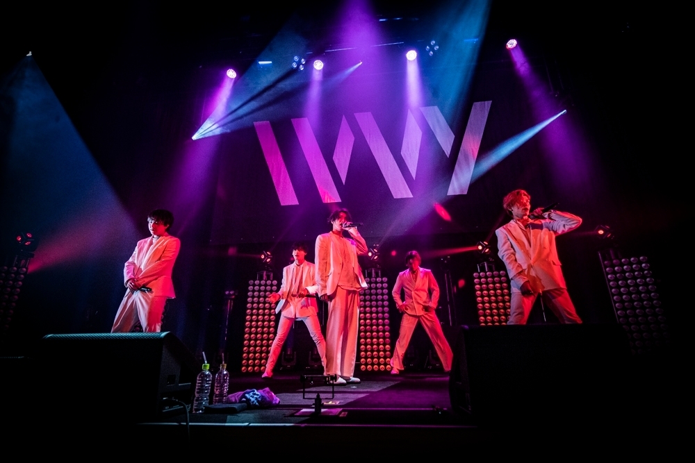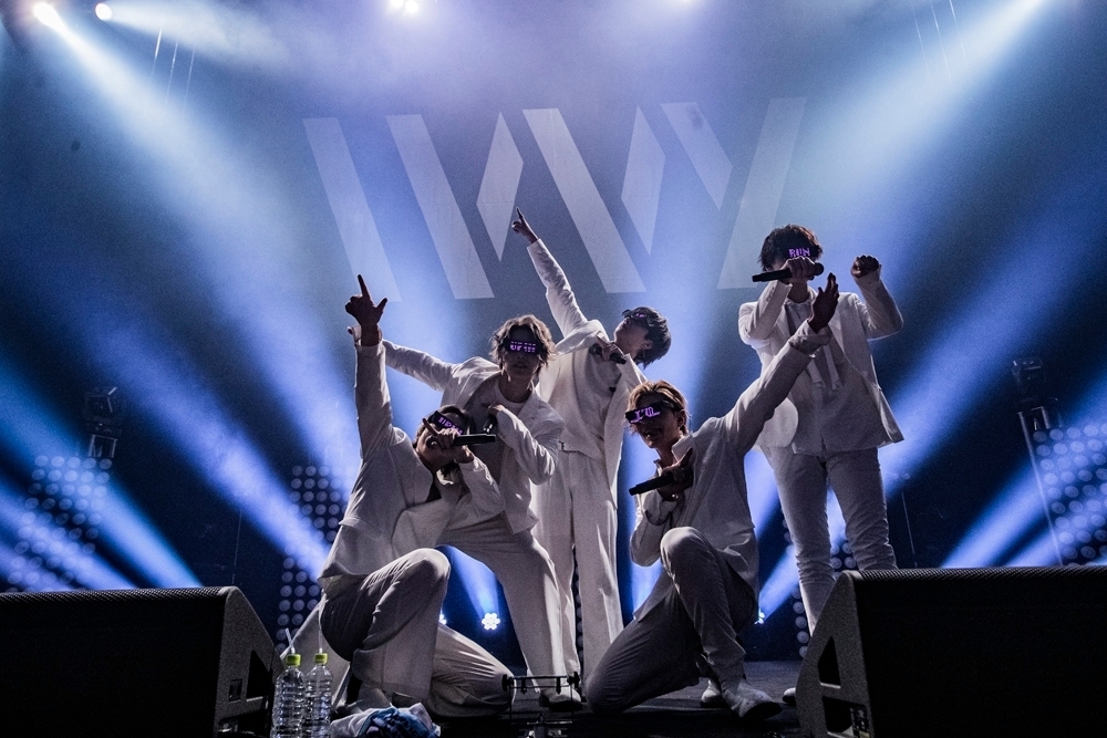 暗転した場内。ニューアルバム『PIE5E』の1曲目「L.O.P(Skit)」をSEにHIROTO、YU-TA、TOSHIKI、KENTO.i、TAIYUがスタンバイするとブルーのレーザービームがステージめがけて走る。オーディエンスが揺らすペンライトで白く発光する客席。舞台が明るくなると、真っ白いスーツに身を包んだ5人がすぐさま視界をジャック! 冒頭からアルバムのジャケットとそっくりそのままの世界観をステージで再現し、彼らはアルバム2曲目の「Lollipop」を歌い出す。間奏で、TAIYUが自分を取り囲む4人をリズムに合わせて次々とキックして倒していくワイルドなアクトが決まったところで、次はイントロからレーザーが灼熱の赤色に変わって「Light on fire」へ。冒頭からアグレッシブモードのIVVYを畳み掛ける。歌詞の《まだ見ぬ先》を目指して、サビのラスト、高身長の5人が織りなす一斉ジャンプで、現IVVYならではのパフォーマンスの破壊力を見せつける。