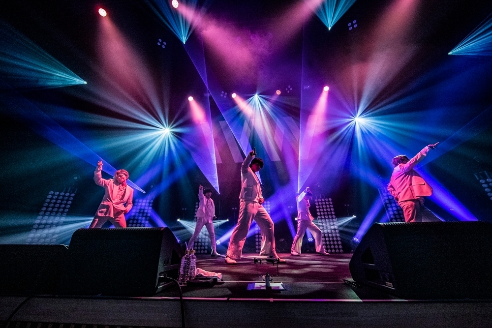 眩しいほどのレーザーが飛びかうなか、サングラスをかけた5人がフロントに並び、始まったのは「Swing」。さっきレクチャーを受けたばかりの振りをメンバーと一体となって観客も踊り出す。バブル時代のクラブを思わせる光景が広がり、この曲をパラパラダンスで振り付けした彼らの遊び心に思わずクスッとしてしまった。