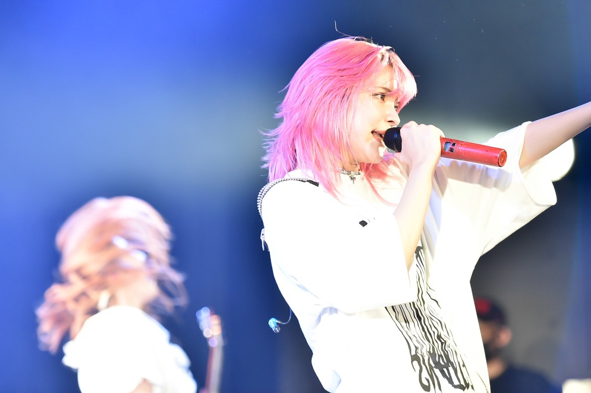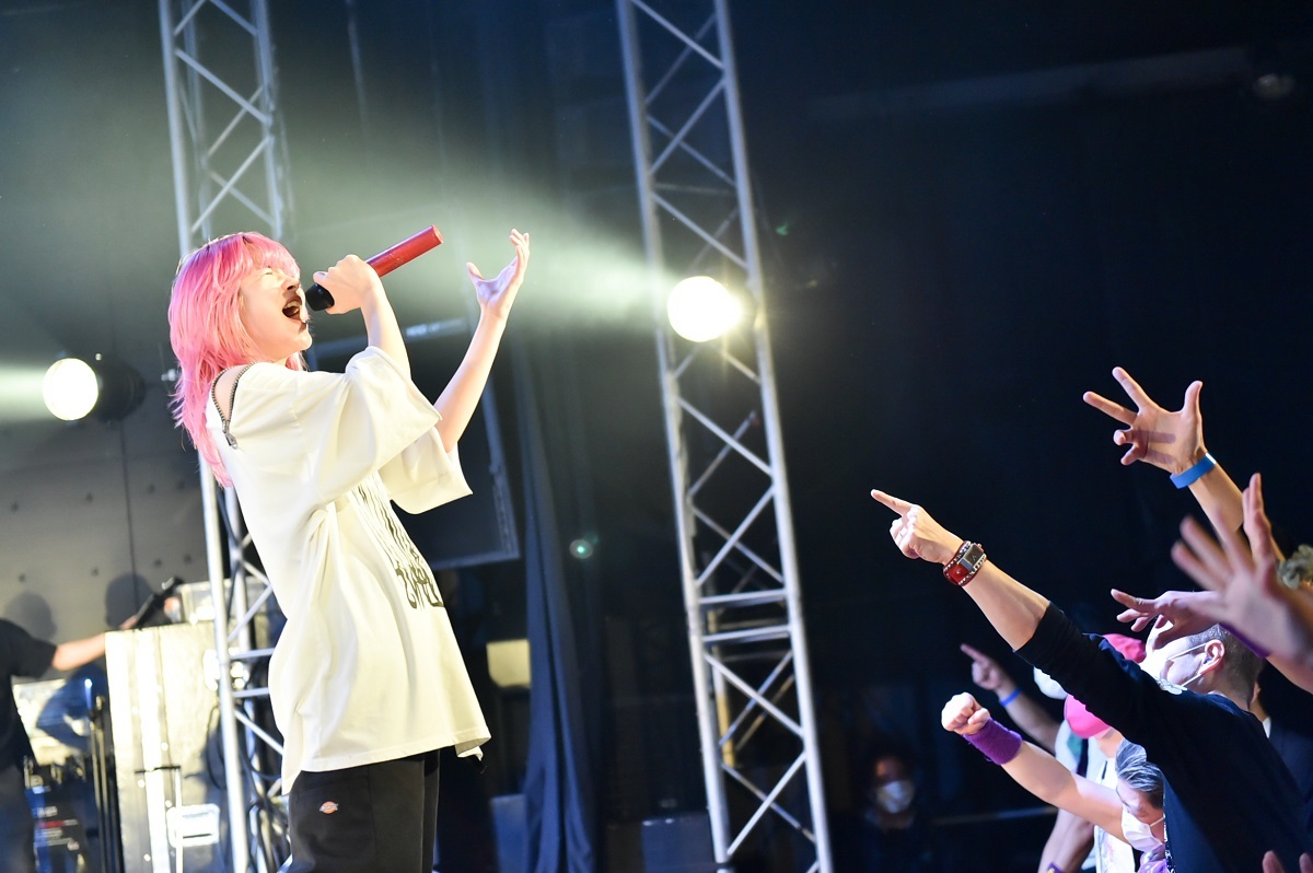 MC中もずっとバンドのように合いの手を入れていたマニピュレーターが、メランコリックなギターのアルペジオを流しだす。あまねがしんみりと「楽しい時間は線香花火のようにずっとは続かない」と語り始め、「ここにいる君の心に歌います」と結んで始まったのは「夏声蝉時雨」。明日のことなんて分からない、だからこそいまを全力で生きようというメッセージを体現するように、アウトロではことのと神者が一心不乱に2ステップを踏む。そこに音楽ジャンルがコロコロと変わっていくハイブリッドな「BAD CAKE」を畳み掛けてフロアをかき乱していった最後、6人が一斉にフロントに並んだときに立ち上がる気迫は、圧巻の一言だった。