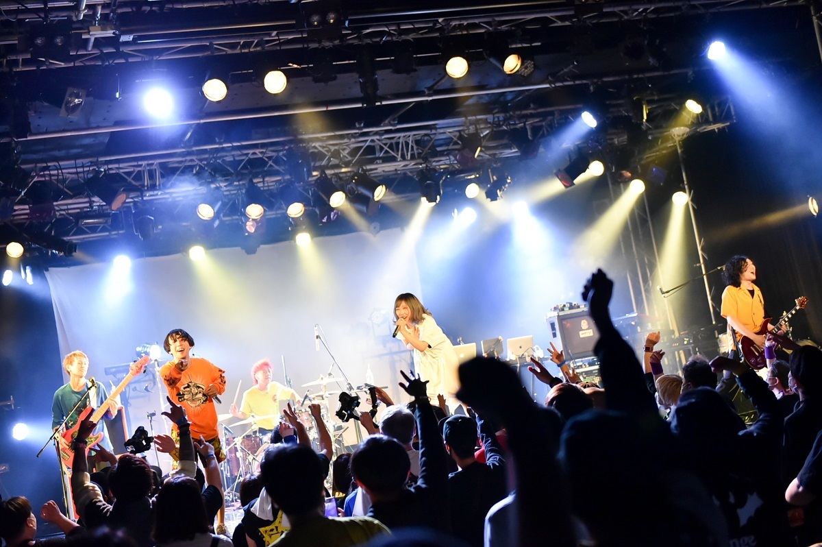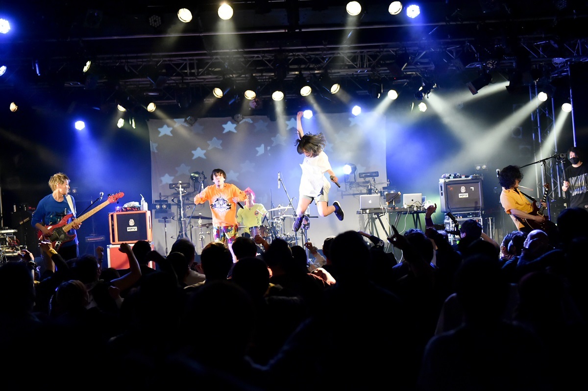 今回が1年ぶりの有観客での対バンライブであることを伝えたF チョッパー KOGAは「声が出せない分、からだ全身で楽しんでいきましょう」と伝え、続けてニューアルバムから「Days」を披露。ここでは楽器隊がハーモニー、コーラスと、パートごとにスイッチしながらコーラスグループのような立体的な歌声を届け、演奏だけではなく歌でもガチャピンのすごさを見せつける。続いて、アルバム曲「MindSet」ではアンジーのラップをフィーチャーしながら、間奏ではリズム隊がインプロのような掛け合いを始め、そこからフュージョンのようなギターソロ、コンテンポラリーなキーボードソロと洪水のようにめまぐるしく押し寄せてくるサウンドで空間を満たしていく。その後に届けた菅波栄純(THE BACK HORN)提供の「超えてゆけ」は、《超えてゆけ、自らを》と心でシンガロングしたくなるようなフレーズをオーディエンスの心に染み込ませ、アンジーがセリフのようにモノローグ調で歌う《世界はとても美しい》が印象的な「I wish I」を切々と歌い上げたあとは、ラスト「何者にもなれなかった僕たちへ」へ。メンバー全員がありったけの想いを込め、この歌を噛み締めながら歌い、演奏して、最後にはなが「今日あなたに会えたこと、嬉しかったです。またライブハウスで会いましょう」という言葉を残して、ステージを後にした。