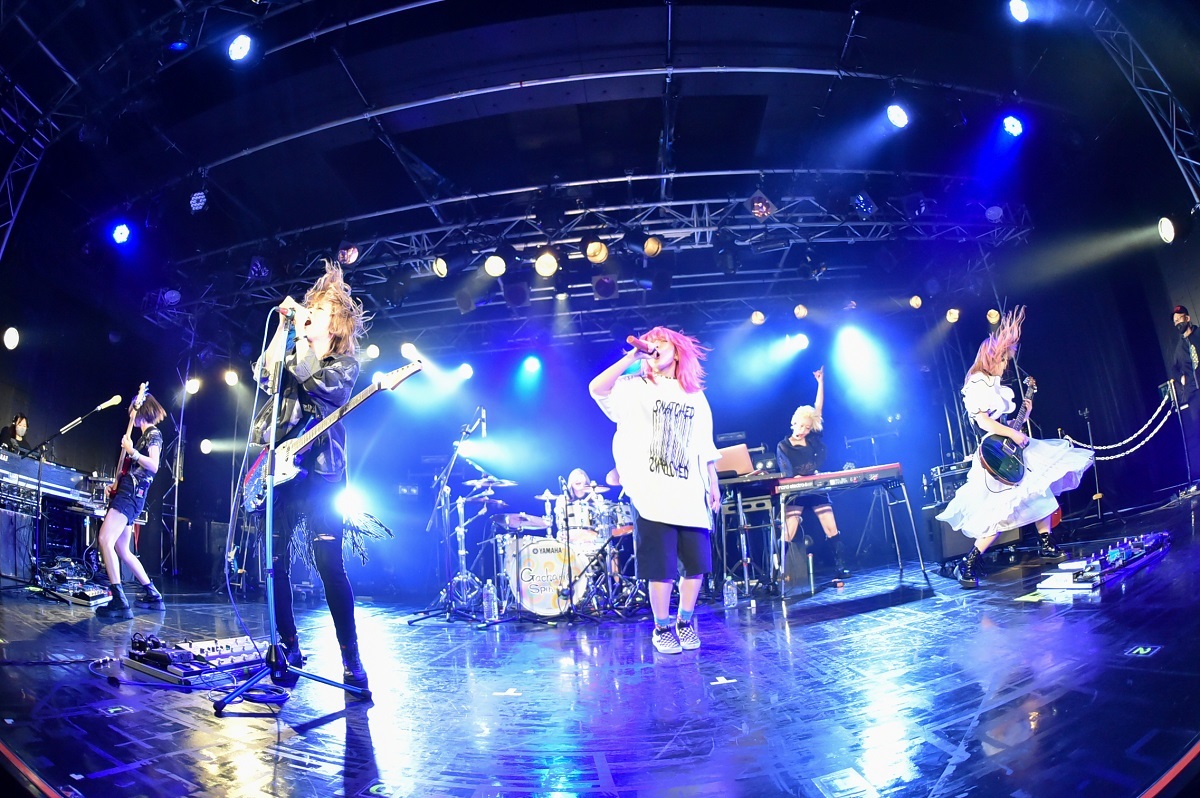ましょ隊のパリピな楽しさ全開のステージの熱を受け、次に登場したのは6人組のガールズバンド、Gacharic Spin(以下、ガチャピン)。リーダーのF チョッパー KOGA(Ba)を始め、はな(Vo)、アンジェリーナ1/3(マイクパフォーマー)、TOMO-ZO(Gt)、オレオレオナ(Key)、yuri(Dr)というメンバー編成で、今年9月に初のセルフプロデュースアルバム『Gacharic Spin』をリリースしたばかりの彼女たち。