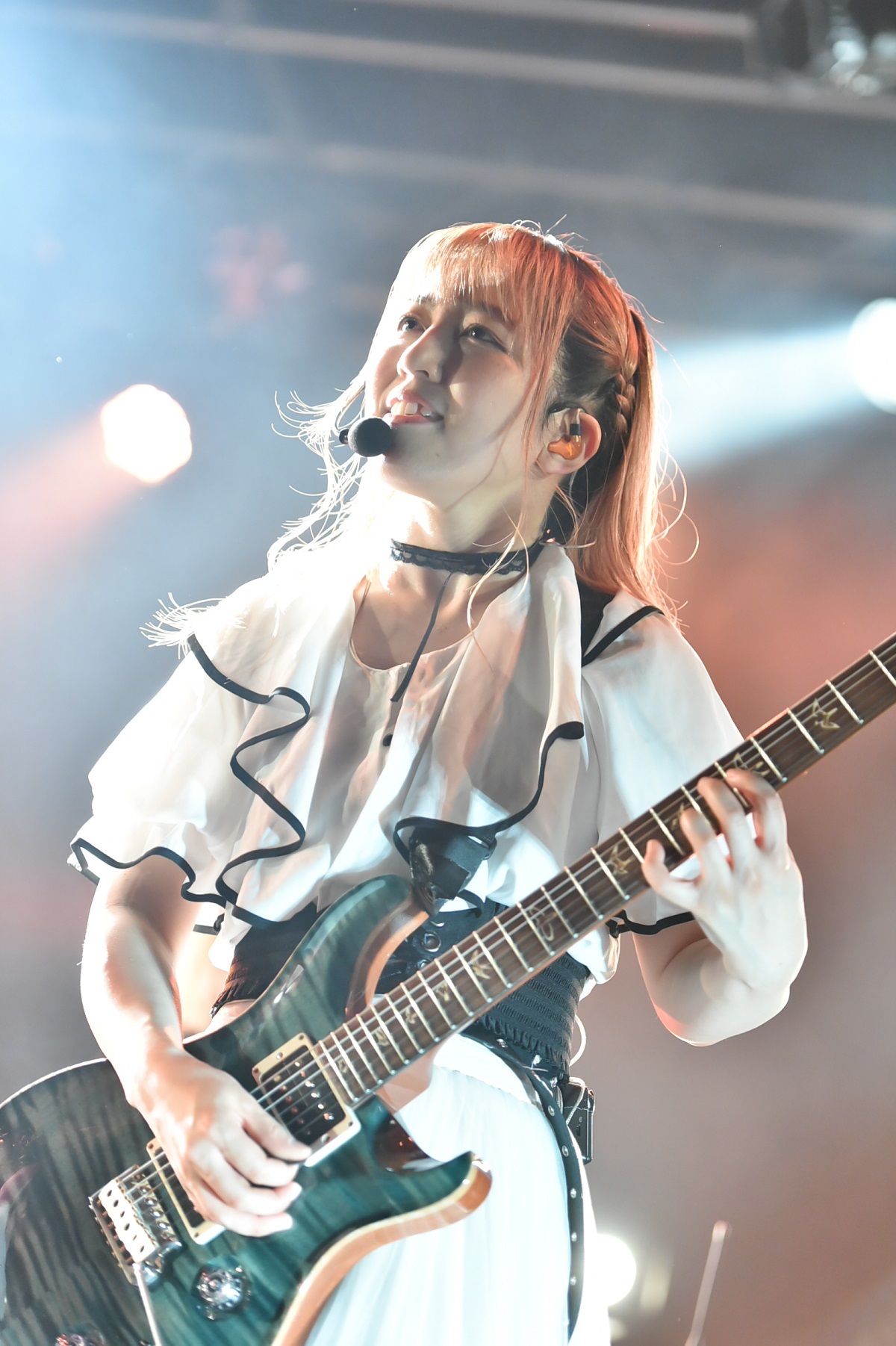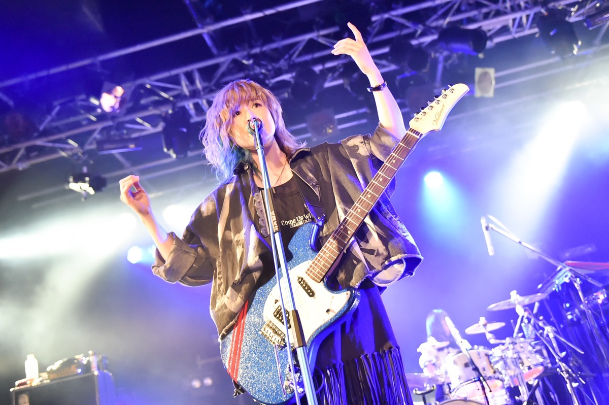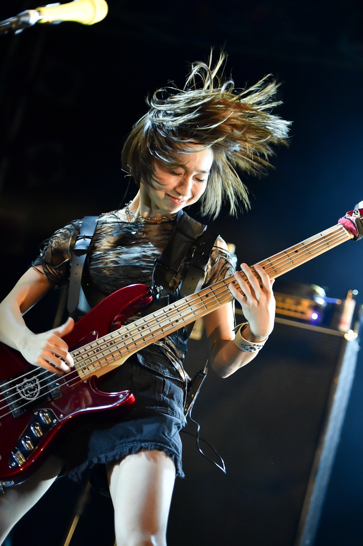 ライブはそのニューアルバム収録曲「1GAME」で幕開け。センターに2人が立つガチャピンのライブ。ギターを弾きながら凛としたオーラを放ち、パワフルな歌声を聴かせるはなはクールビューティーな佇まい。それとは対照的に、ピンク髪を激しく揺らし、ラッパーのような雰囲気で「コブシを上げろー!」とワイルドにフロアを煽り、エモーショナルな歌を放つアンジー(アンジェリーナ1/3)。その後方で、yuriはほっこりするような穏やかな笑顔を浮かべ、バンド全体を見渡しながらパワフルな音でツインペダルを鳴らし、上手後方ではダイナミックな奏法でキーボードを激しく弾きまくるオレオレオナが、妖艶な歌声で曲に色合いを加える。ワンピースの裾をヒラヒラさせ、どこまでもガーリーな仕草でテクニカルなフレーズを華麗に繰り出していくTOMO-ZO。多くのベーシストたちの憧れの的でもあるスラップのテクニシャン、天才的グルーヴメーカーのF チョッパー KOGA。6人6色の存在感が際立っている。