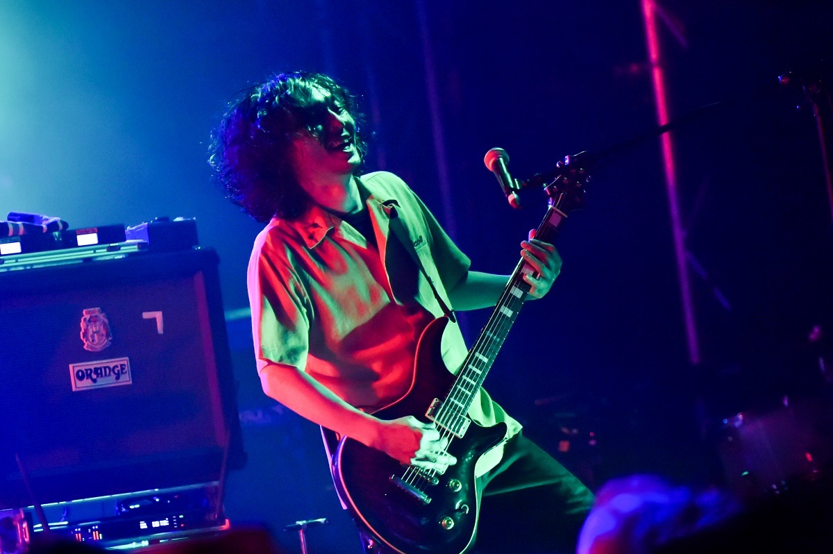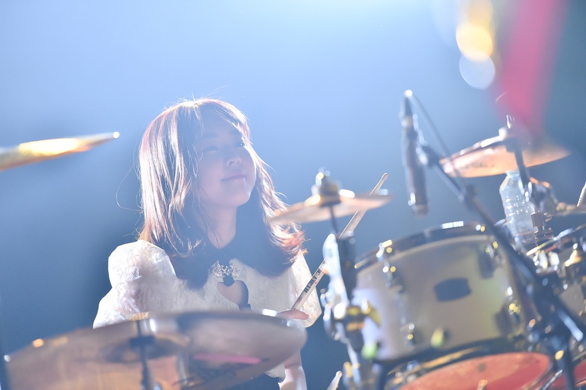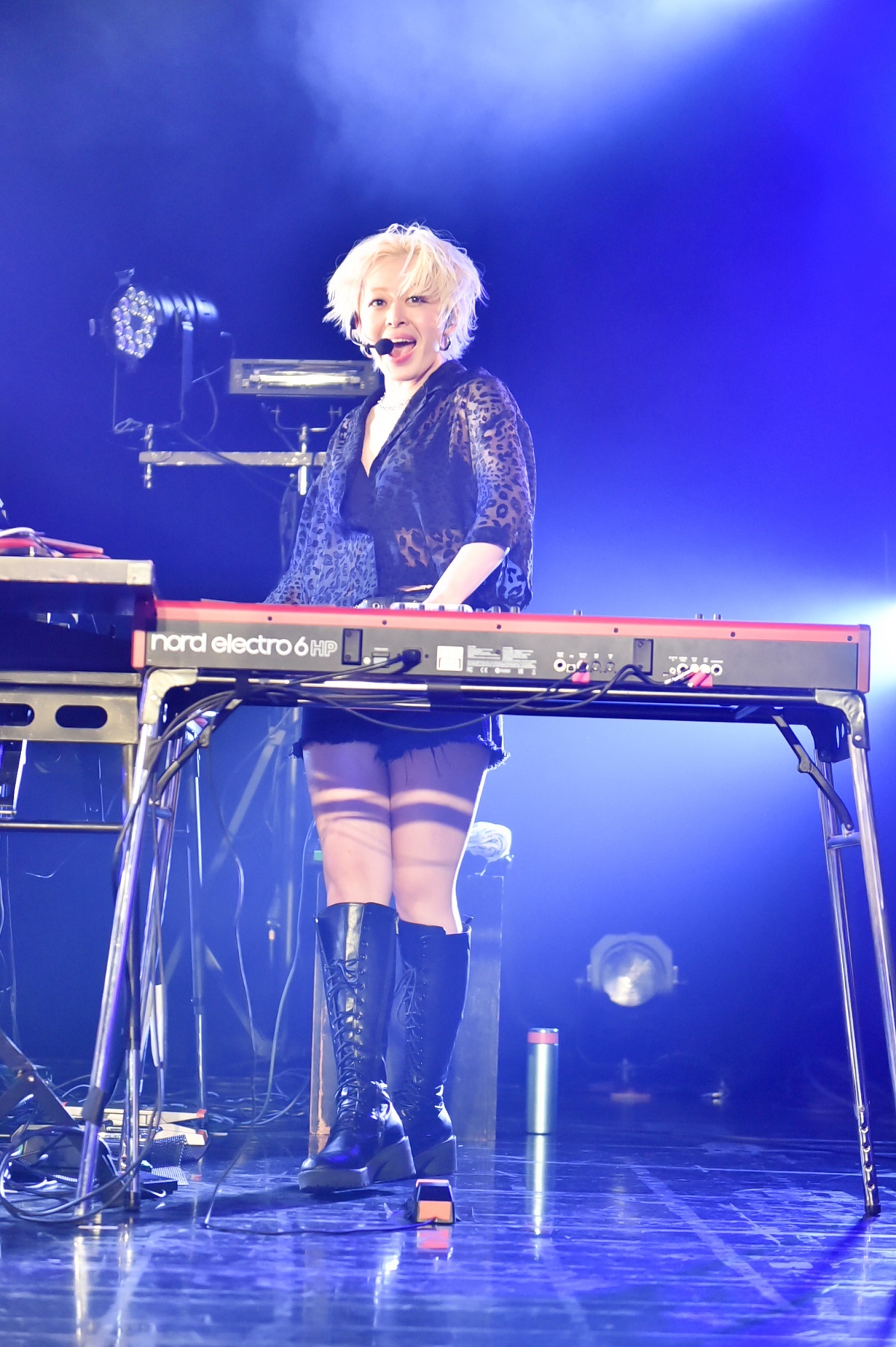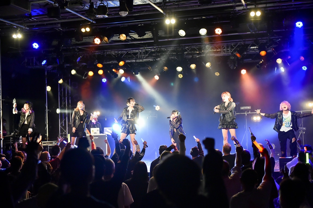 ライブはそのニューアルバム収録曲「1GAME」で幕開け。センターに2人が立つガチャピンのライブ。ギターを弾きながら凛としたオーラを放ち、パワフルな歌声を聴かせるはなはクールビューティーな佇まい。それとは対照的に、ピンク髪を激しく揺らし、ラッパーのような雰囲気で「コブシを上げろー!」とワイルドにフロアを煽り、エモーショナルな歌を放つアンジー(アンジェリーナ1/3)。その後方で、yuriはほっこりするような穏やかな笑顔を浮かべ、バンド全体を見渡しながらパワフルな音でツインペダルを鳴らし、上手後方ではダイナミックな奏法でキーボードを激しく弾きまくるオレオレオナが、妖艶な歌声で曲に色合いを加える。ワンピースの裾をヒラヒラさせ、どこまでもガーリーな仕草でテクニカルなフレーズを華麗に繰り出していくTOMO-ZO。多くのベーシストたちの憧れの的でもあるスラップのテクニシャン、天才的グルーヴメーカーのF チョッパー KOGA。6人6色の存在感が際立っている。