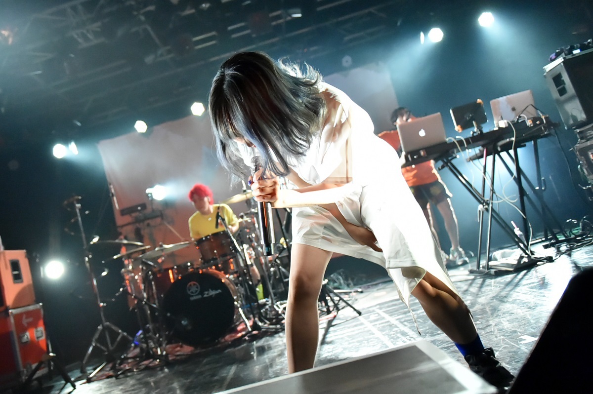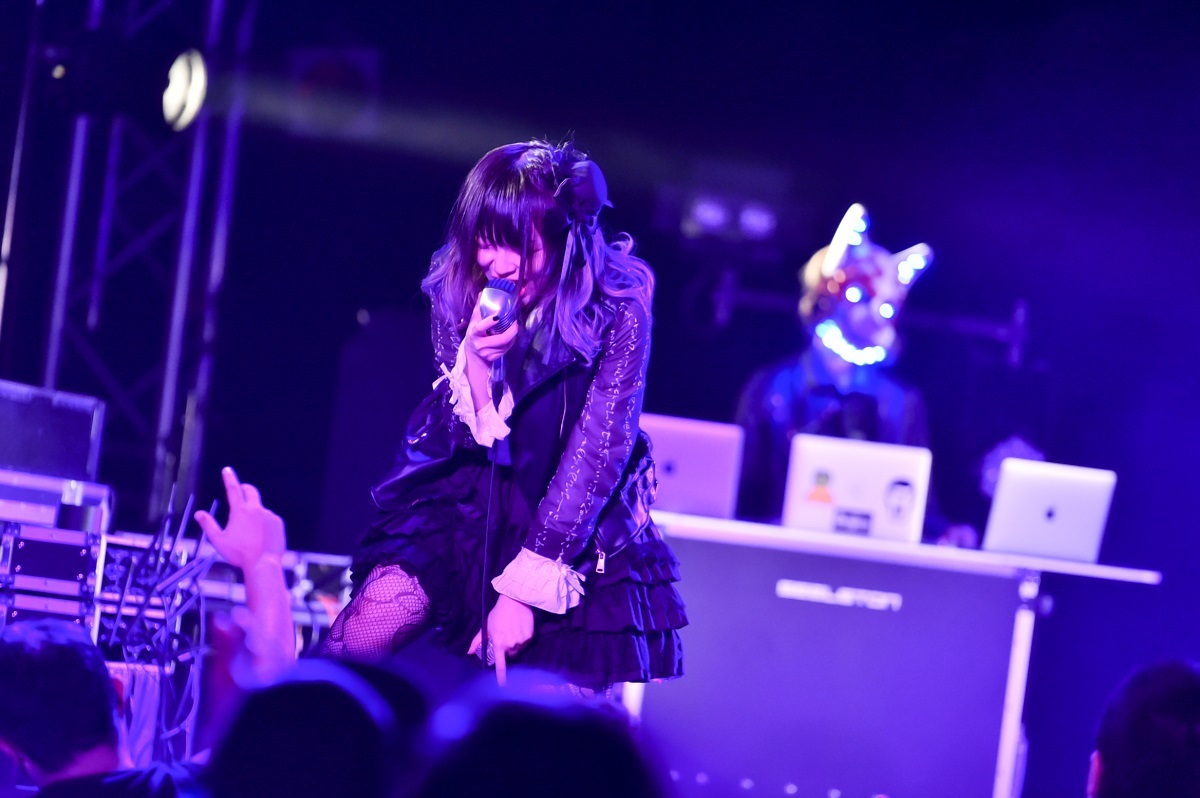 「お祭りだ、Everybody。ハンズアップ! 楽しんでいくぜ!」とgariがクラップを求める前から場内はすでにクラップの嵐。バジルがセンターに構え、ライブは和風パーティーソング「ヒメサマスピリッツ」でスタート。歌いながらバジルが扇子を振ると、クラップはさらに勢いよく咲き乱れ“そいや”の掛け声でテンションはどんどん上昇。ポップな「革命のマスク」では、明るい曲調に合わせて照明も全開! ライトに照らされ、オーディエンスの笑顔が見えてくると、gariのテンションがみるみる上がり、喜びが身体中から溢れ出す。いつも以上のスピードでステージを縦横無尽に駆け巡りながら卓に戻ってはVJを操作し、フロントに出てきてはマイクでスクリーモを入れながら、おかっぱヘアを揺らし、無邪気な笑顔でジャンプを何度も何度も繰り返すgari。このがしゃがしゃと忙しないgariのパフォーマンスにのせられ、場内はすでにましょ隊のワンマンのような一体感が生まれている。