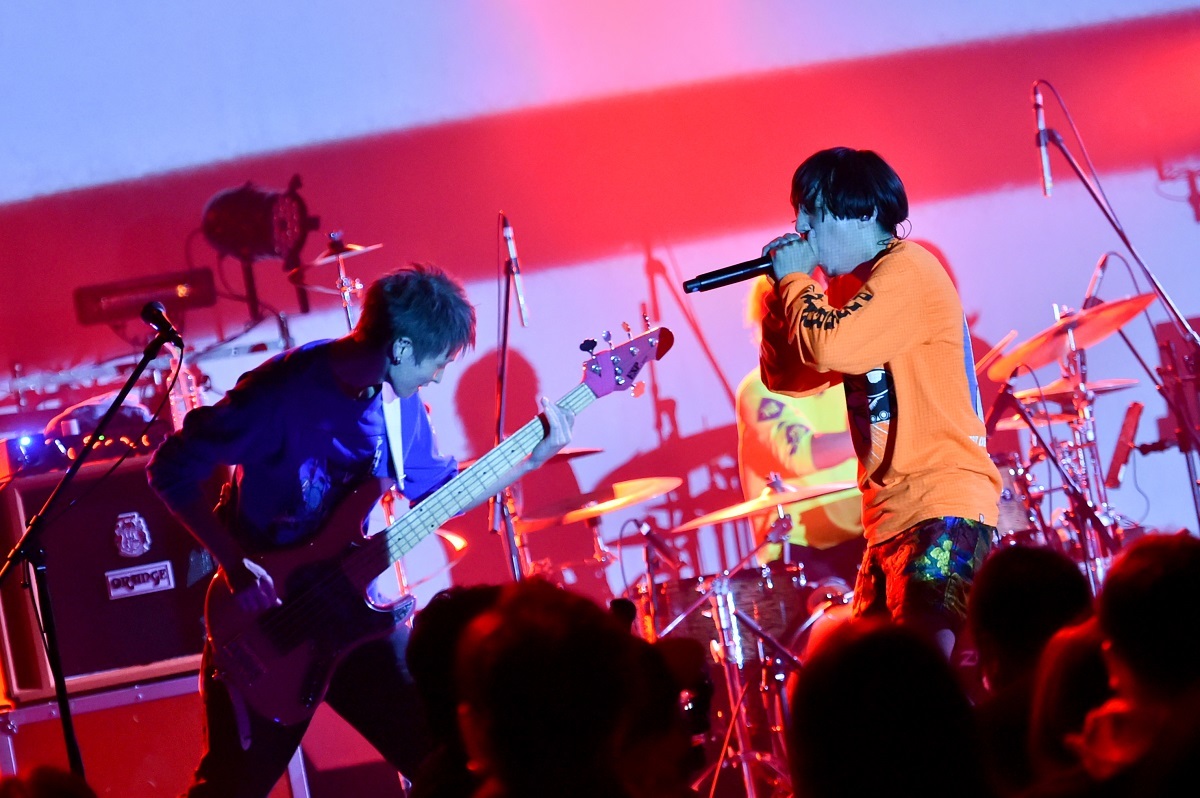 続いて、シンセのイントロから「まぶたの裏のLED」を体を揺らして味わったあとは、gariがピコピコシンセのイントロに「踊ってちょうだい!」と言葉をのせ「完全無敵のぶっとバスター」へ。エモーショナルに歌い上げるバジルの後ろで、gariがバジルの頭からツノが生えるような仕草をしたり、gariがシャウトするときはバジルがものすごいヘドバンを見せてフロアを盛り上げる。