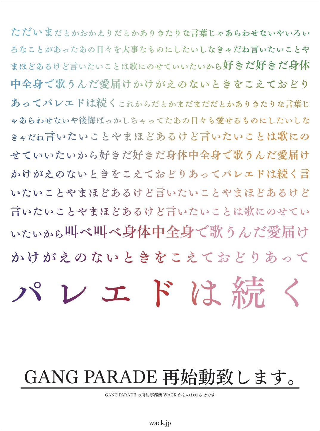 2020年3月よりGO TO THE BEDSとPARADISESという2つのグループに分裂し、事実上活動休止状態となっていた音楽事務所・WACK所属のアイドルグループGANG PARADEが再始動。1月1日(土)読売新聞の朝刊広告にて再始動が突如発表され、1月2日(日)に渋谷Spotify O-WESTにて再始動後の初ライブを実施した。