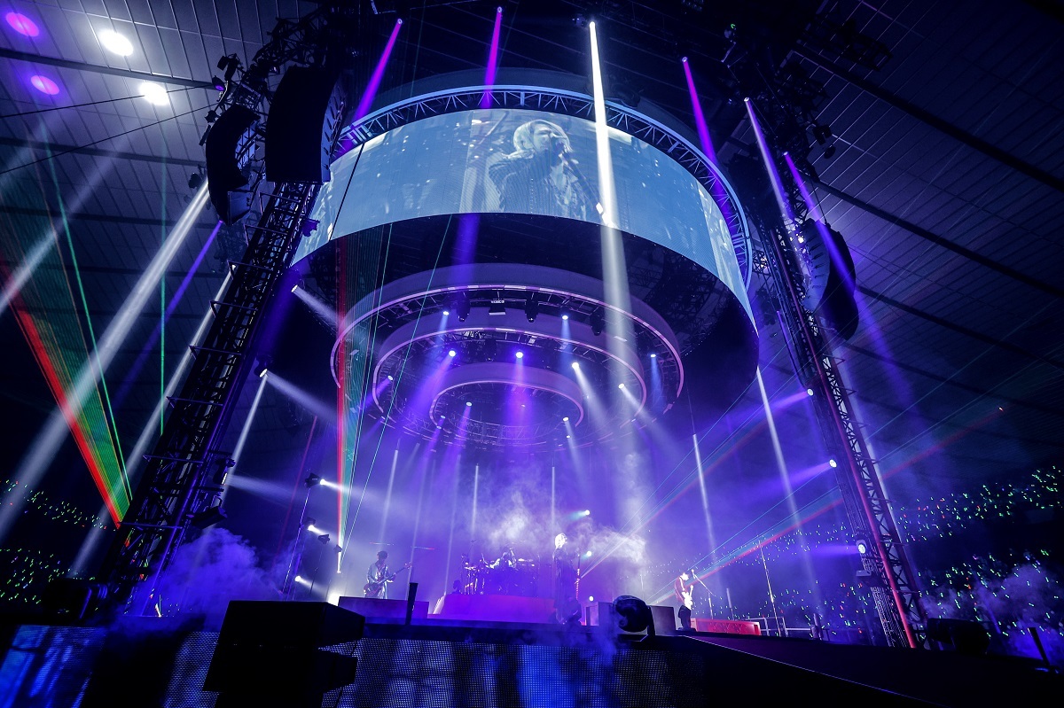 アンコールでは、LEDヴィジョンに映し出された大阪の街、そして彼らの結成当初のホームグラウンドであるライヴハウス難波ROCKETSに通う1人の少女が映し出された。少女はステージを照らすようにスマホの光を灯すと、その光は、国立代々木競技場第一体育館の客席の景色へと繋がり、客席はオーディエンスが灯すスマホのライトで埋め尽くされた。満天の星空が広がる中で届けられたのは「ミライ」。メインステージの上で光るミラーボールから放たれる光と客席から放たれるスマホの光は、L’Arc~en~Cielらしいメロディの運びが美しい「ミライ」を、より感動的に、言葉にできないほどの美しさへと導いてくれた。