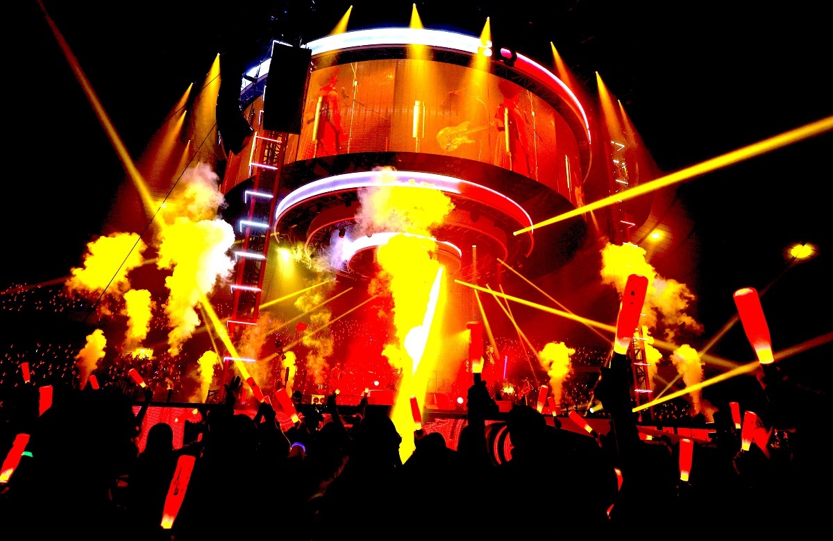 ライヴ終盤は、「Driver's High」。ステージが回転し、メンバーはメインステージから伸びた4本の花道に足を運び各方面のオーディエンスを余すことなく楽しませた。