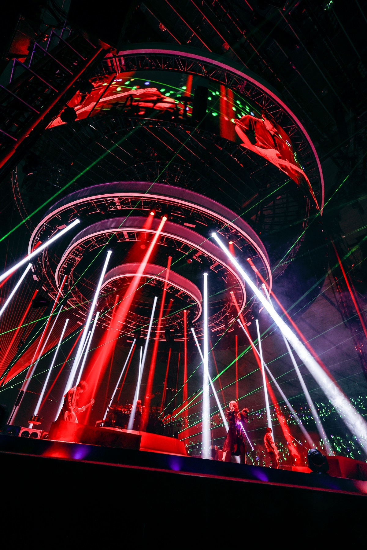 定刻通りに会場内の照明が落とされると、センターステージを包み込む形で設置されていたスクリーンに映画の一場面のような危機迫るシーンが360°に映し出された。車に乗ったまま巨大スクリーンで映画鑑賞ができるドライヴインシアターを彷彿させるような壮大な風景だ。オーディエンスのバットマラカスライトで染め上げた赤は、薄暗く赤黒い照明に照らされたステージに溶け込んで境界を取り除き、重厚な檻の中に閉じ込められたかのようなhyde(Vo)、ken(Gt)、tetsuya(Ba)、yukihiro(Dr)の姿を浮かび上がらせた。1曲目に選ばれていたのは、yukihiroのルーツを感じさせるインダストリアルでダークな印象の「get out from the shell」。破壊的な世界観の中で、おどろおどろしいギターフレーズに絡み付くヴォーカルが低い温度で生々しく会場に浸透し、ダンスビートが叩きつけられていくその独特な表現力は、成熟したバンドの在り方を見せ付けられた、最強の幕開けであった。