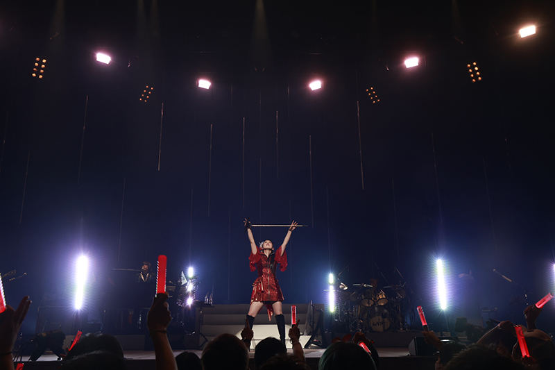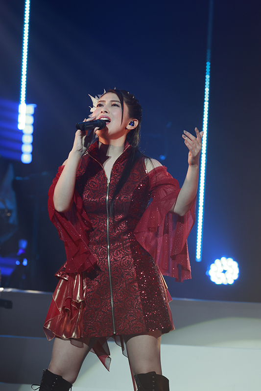 ライブも後半戦に突入し、赤のドレスにお色直しした茅原実里が「みんな行くぜー!」と威勢良く登場すると「Dream Wonder Formation」「TERMINATED」「Paradise Lost」とアップテンポなナンバーを立て続けに披露。「Dream Wonder Formation」は2011年の神奈川県民ホールのカウントダウンで初解禁された縁のある1曲だし、「TERMINATED」では場内を真紅に染め上げ、「Paradise Lost」ではステージに炎が噴き乱れる。真っ赤なライトに照らし出されたシルエットは威風堂々。会場のボルテージも最高潮に達する。