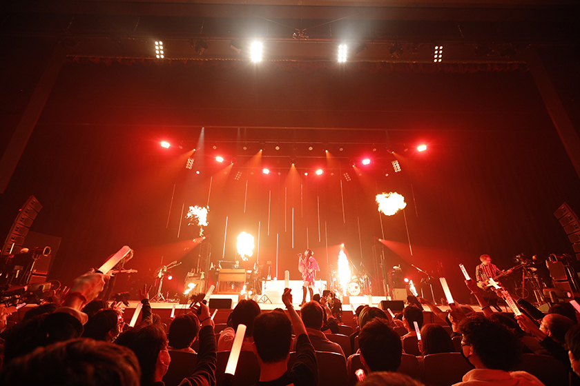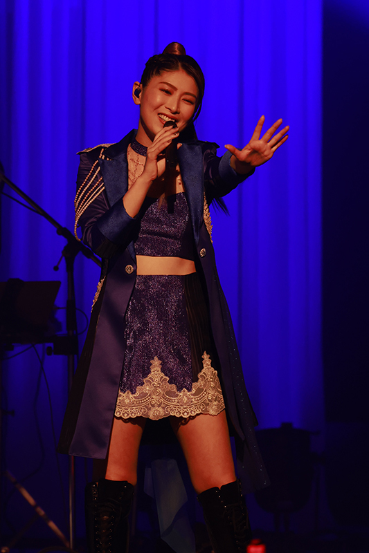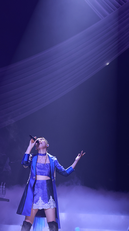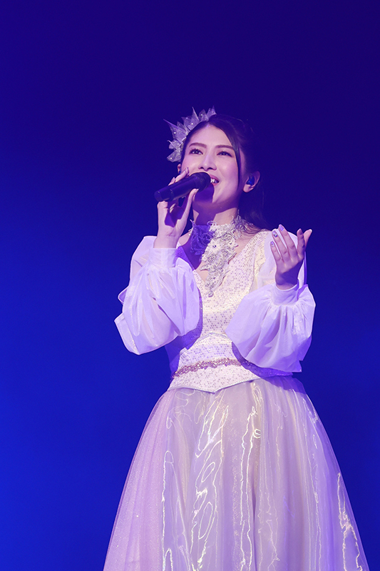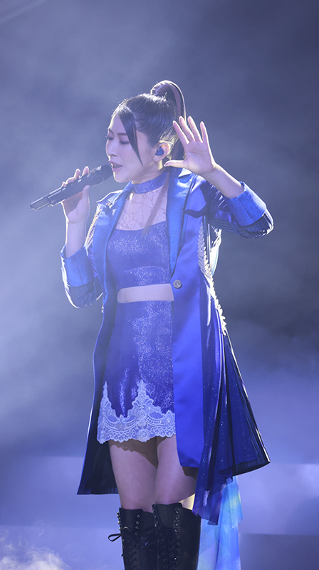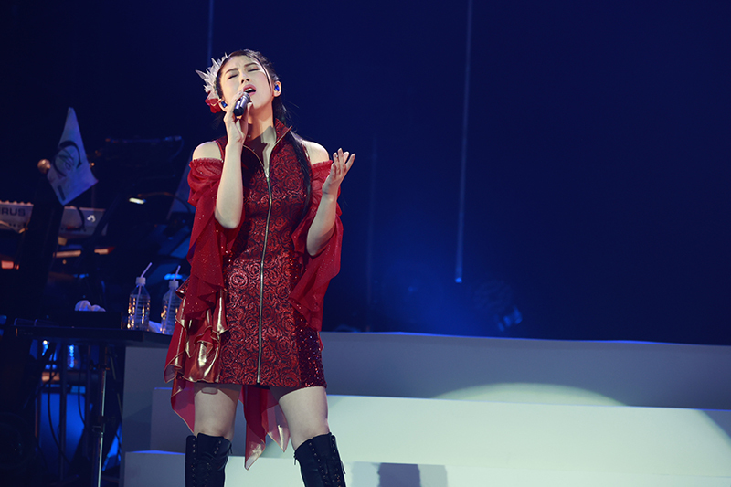 TVアニメ「ヴァイオレット・エヴァーガーデン」エンディング主題歌の「みちしるべ」は彼女の歌声なしには成り立たなかった楽曲だろう。数々のアニメを歌手としても彩ってきた彼女にとって、タイアップ曲はまさにそんな彼女の足跡をたどるマイルストーンだ。自分自身の歌手としての道しるべを1つ1つ確かめるように、慈しむように、そして懐かしむようにその優しい歌声を会場に響かせる。