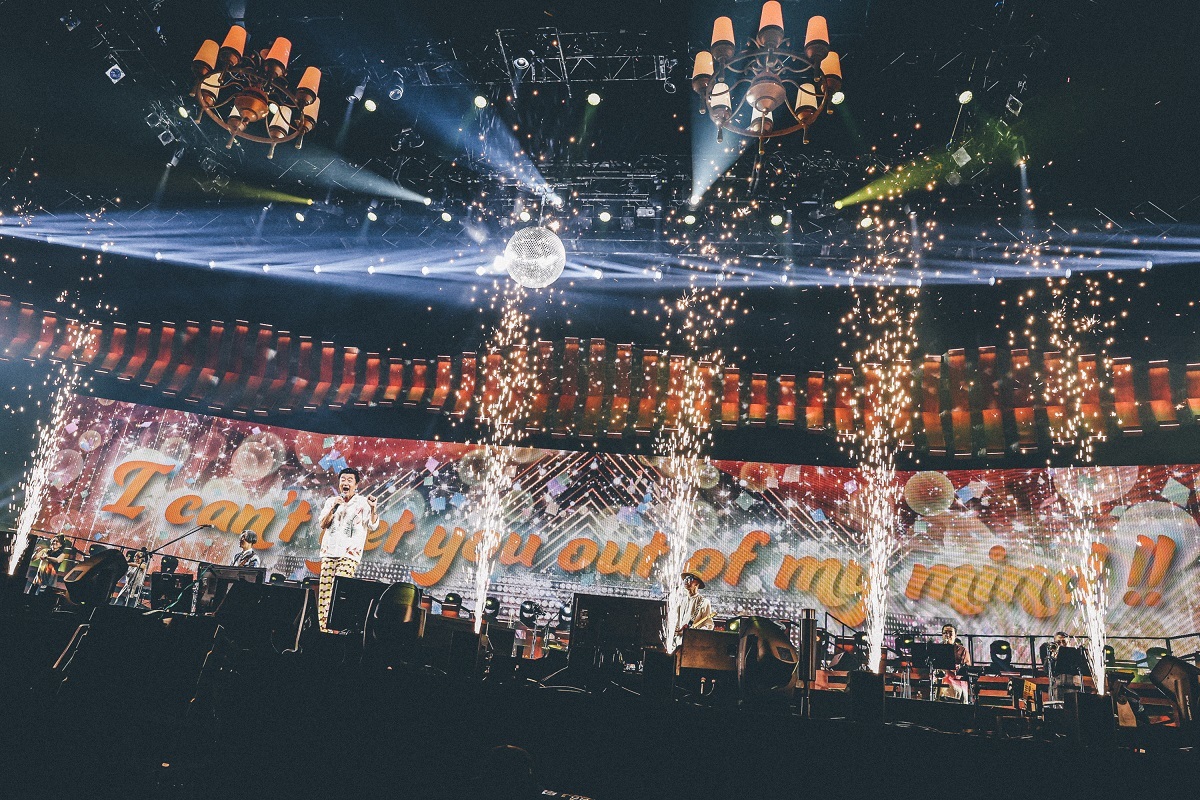 「OSAKA LADY BLUES~大阪レディ・ブルース~」は各地でご当地ソングとして歌詞を変えて披露されてきた。この日は「新YOKOHAMA LADY BLUES~新・横浜レディ・ブルース~」として、地名や観光名所の名前も交えつつ、《五木ひろしもいしだあゆみもユーミンも歌にしたこの街》といったフレーズも交えつつ。遊び心と気配りがミックスした楽しい演出だ。「エロスで殺して(ROCK ON)」ではダンサーによるポールダンスの演出もあった。