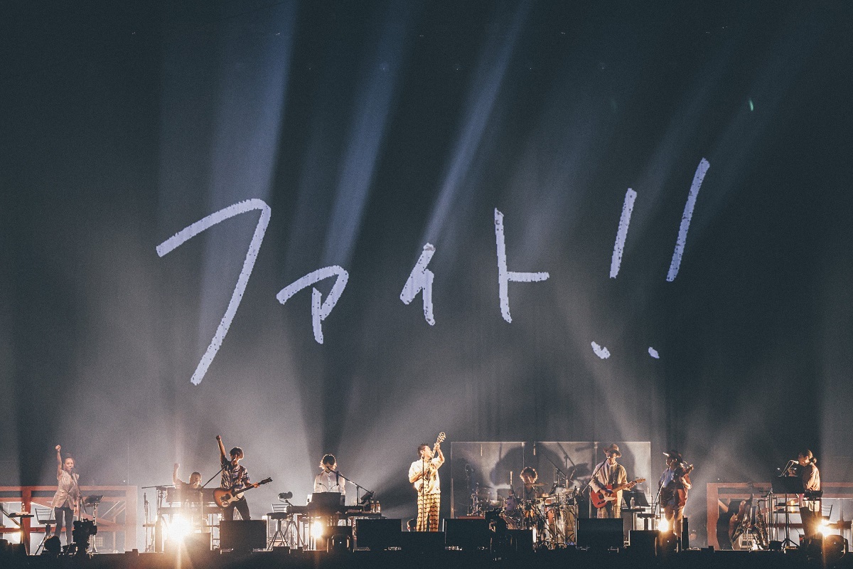 12,000人のハンドクラップに包まれながらの歌となったのは9月リリースのEP『ごはん味噌汁海苔お漬物卵焼き feat. 梅干し』(以下、『ごはんEP』)収録曲の「炎の聖歌隊[Choir(クワイア)]」。観客に配布されたナマケモノライト(リストバンド)の光が揺れながら輝いている。声は出せないが、観客は拍手や光によって思いを懸命に伝えていた。おそらくライブで演奏することを想定して作られた曲だろう。《開演お待ちどうさん》《ご来場 大変御足労さん》といった歌詞など、このシチュエーションにぴったりなフレーズが満載。歌に込められた思いに観客がしっかり応えて、一体感あふれる空間が出現した。