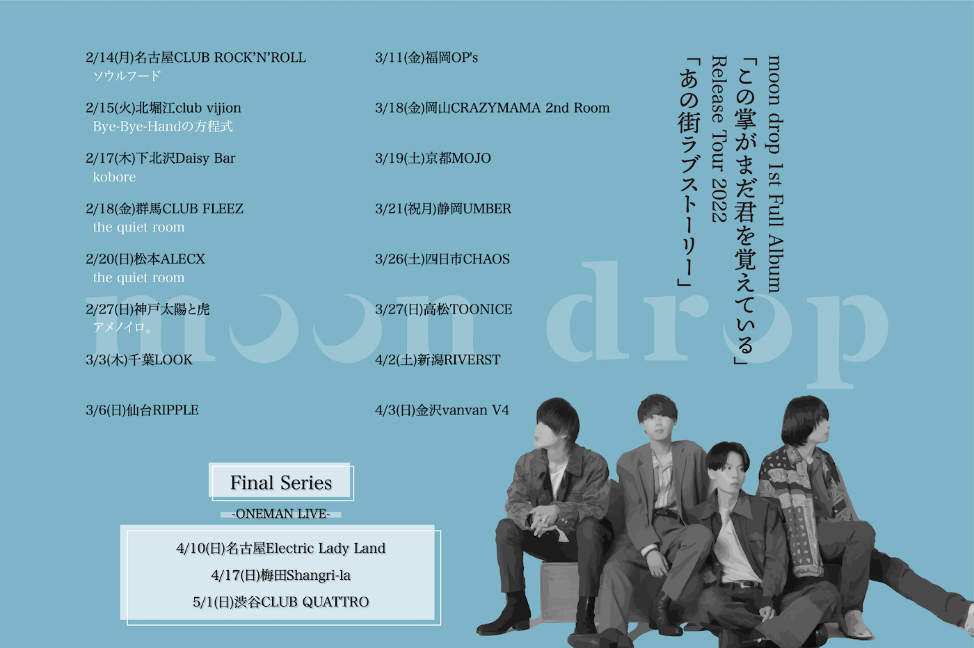 “愛だの恋だのラブソングだけを歌い続けるバンド”moon dropが、1st Full Album『この掌がまだ君を覚えている』の発売を記念して、CD購入者対象のライブイベントの開催を発表した。