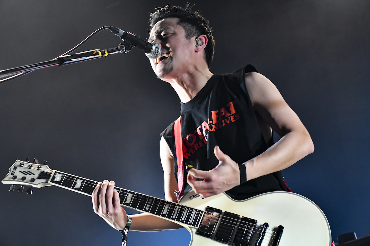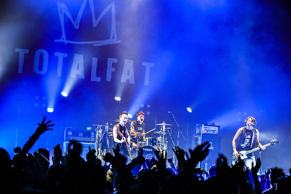 4組目はTOTALFAT。Bunta(Dr/Cho)が踏むバスドラに合わせて手拍子が自然発生。Jose(Vo/Gt)の「Zepp Tokyo、パーティーするぜー!」と聴き慣れたカウベルのリズムを合図に1曲目の「PARTY PARTY」が始まった。モッシュ・ダイブはできずとも、フロアではそれぞれがそれぞれにハイになっている。コロナ禍以前にはシンガロングが起きていた「晴天」では、きっと心の中で唄ってくれていると信じ、無音を恐れず、観客にフレーズを託す3人。すると今度はバンドの気持ちに応えるように、フロアから強い手拍子が返ってきた。