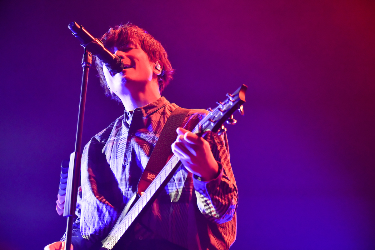 バンドの演奏で曲間を繋げながら、<例えあなたの時計止まってもまた会えると信じて止まらないから>というフレーズにZepp Tokyoへの想いを託した「シンクロック」、間奏に高橋武(Dr)のソロを組み込んだ「シンセンス」などを続けて披露。「全部音楽で返します」という発言通りの展開のなか、4人は高ぶる気持ちにダイブするように演奏。特にボーカルはいつになく熱が入っている。その熱量が頂点に達したのは、ちょうどこの日未明にMV再生数1億回を突破したメジャーデビュー曲「オドループ」が「何回来たとか、何回観たとか関係なく、今、この1人に届いてほしい!」(三原健司・Vo/Gt)という想いで鳴らされた瞬間。盛り上がる観客を前に満面の笑みを見せるのは三原康司(Ba)。お立ち台の上、上体を大きく反らしながらソロを披露するのは赤頭隆児(Gt)。高橋のプレイがバンドをさらに勢いづけ、フロアのテンションも上がるなか、健司は観客の表情を確かめて頷いている。