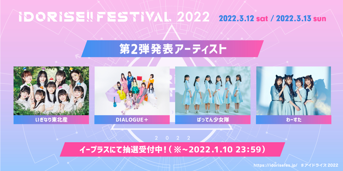 『IDORISE!! FESTIVAL』は2019年にスタートしたシブヤテレビジョンが主催するサーキットイベントで、今回は2DAYS、6会場連動のサーキットイベントでの開催を予定している。今回、第二弾出演アーティストとして、いぎなり東北産、DIALOGUE+、ばってん少女隊、わーすたの4組が発表された。出演者は今後も随時追加される。
