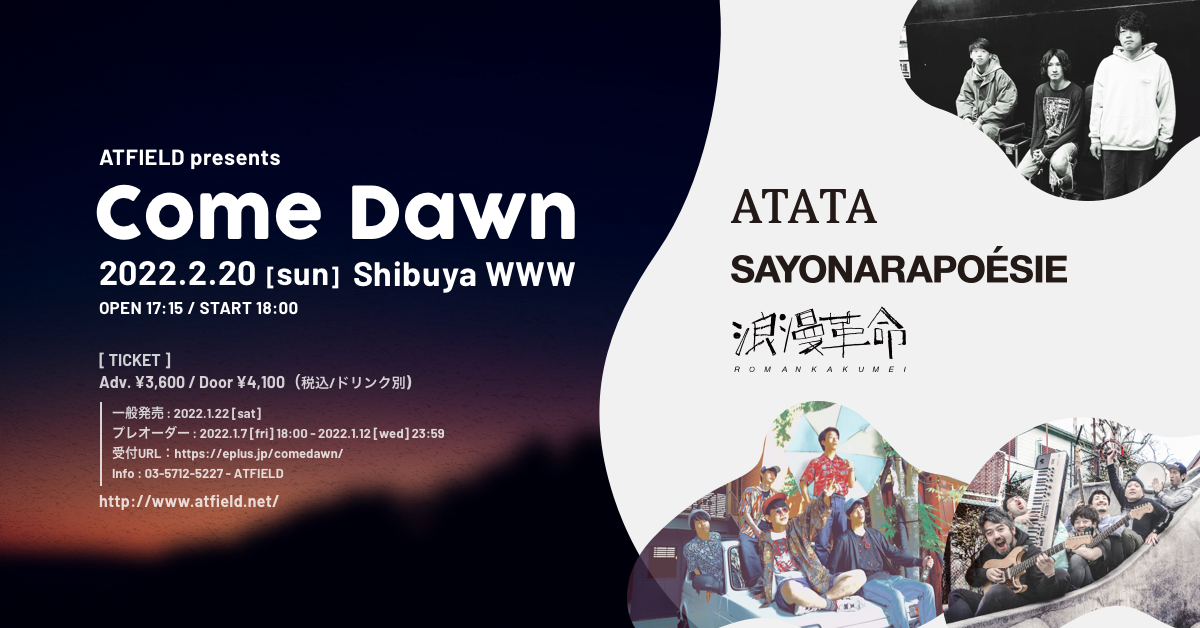 昨年11月に開催されたLIVE HOUSE FEVERでの入場無料ワンマン公演よりライブ活動を再開した「ATATA」、昨年末にベーシストが正式加入となった「さよならポエジー」、配信シングル「ひとり/ふたり」をリリースした「浪漫革命」の3組が出演となるイベント『Come Dawn』が東京・渋谷WWWにて2月20日(日)に開催される。