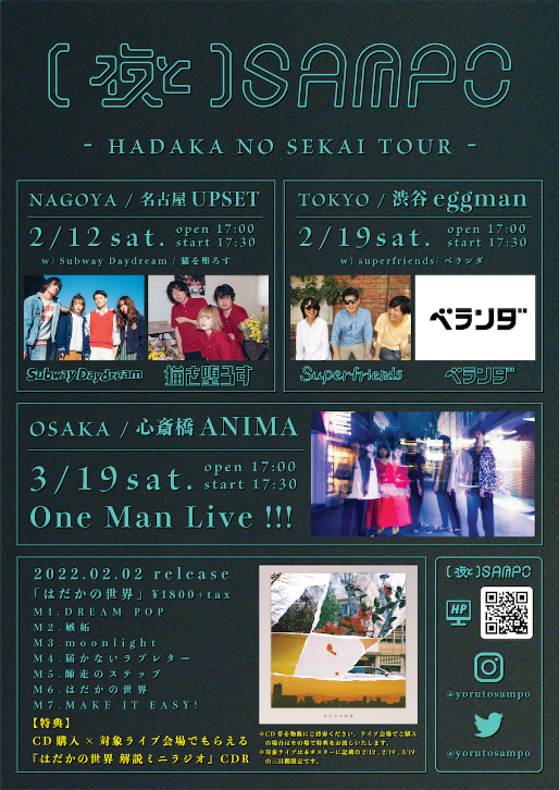 『HADAKA NO SEKAI TOUR』は、(夜と)SAMPOが2月2日(水)にリリースする2ndミニアルバム『はだかの世界』を携えて開催するツアー。これまでに、2月19日(土)開催の東京編にベランダ、2月12日(土)開催の名古屋編にSubway Daydreamが出演することがわかっていた。