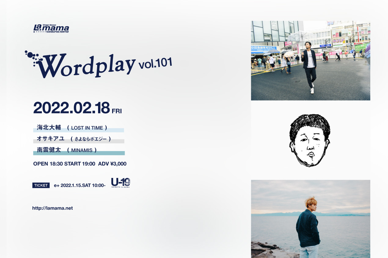 今年の5月で設立40周年を迎える渋谷La.mamaで、2月18日に渋谷La.mamaにて海北大輔(LOST IN TIME)、オサキアユ(さよならポエジー)、南雲健太(MINAMIS)の3マンライブ『Wordplay vol.101』が開催される。
