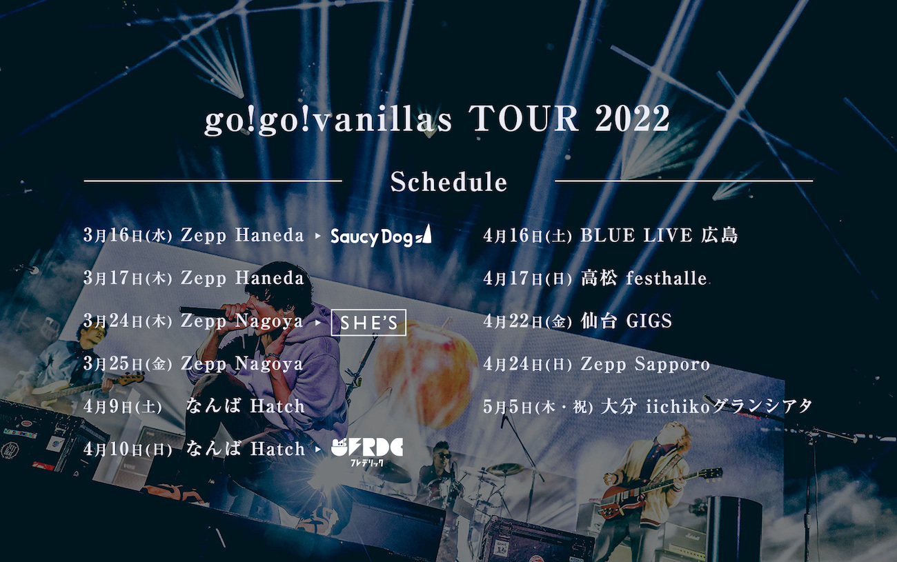 全11公演開催される全国ツアー『go!go!vanillas TOUR 2022』。2DAYSにて開催となる東名阪公演のうち、1公演は対バンを招いての開催となる。今回、その対バンアーティストが解禁となった。3月16日(水)Zepp Haneda公演にはSaucy Dog、3月24日(木)Zepp Nagoya公演にはSHE’S、4月10日(日)なんば Hatch公演にはフレデリックを迎える。