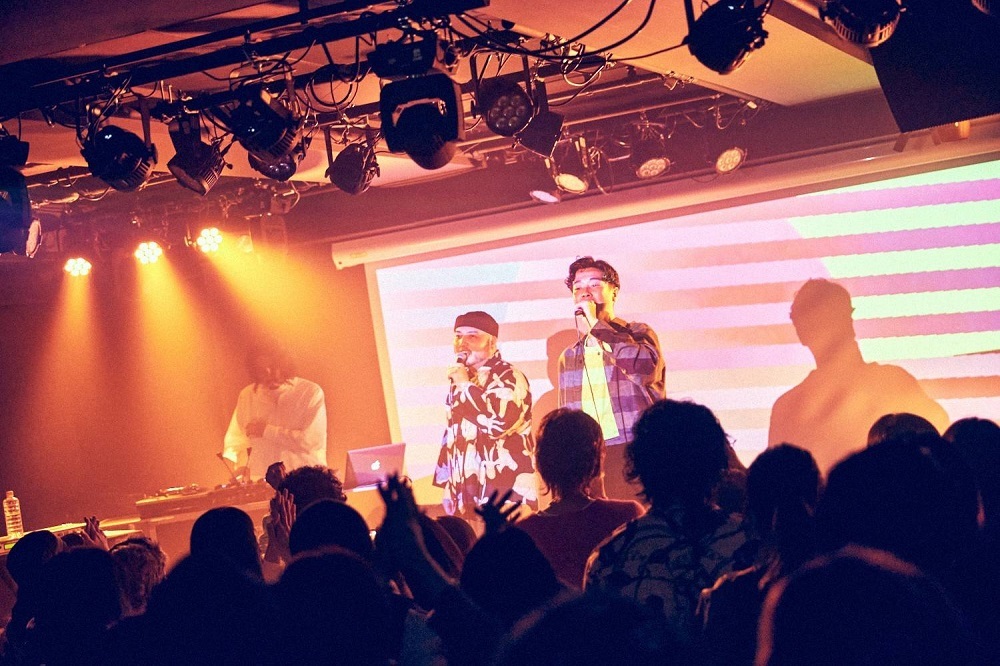 バックDJは2015年の『DMC JAPAN』でチャンピオンに輝いた実績を持つDJ SHOTA。sankaraのライブ活動を屋台骨で支えてきたお馴染みの存在だ。映像の制作はVJ Ryomaで、この日の現場はVJ HIDeが担当し、二人のパフォーマンスを豊かに彩る。先に一人でステージに立ったDJ SHOTAが1曲目の「hide and seek」を鳴らすと、TossとRyoがゆらりと登場。音楽を空間に溶け込ませるように、開場と開演の境界線をシームレスにした平熱のオープニングが実にsankaraらしい。そこから、トラックの夢見心地なサウンドスケープに寄り添いながらも、自己の本質を探すような強さを併せ持つリリックが光る「Louder」、本格派のファンキーなネオソウル「Move」へと、じわじわとパフォーマンスの濃度を高めていく。