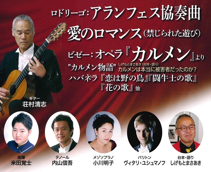 指揮は米田覚士、出演者はメゾソプラノ・小川明子、ギター・荘村清志、バリトン・ヴィタリ・ユシュマノフ、テノール・内山信吾が決定している。プログラムは、ロドリーゴ:アランフェス協奏曲、ビゼー:オペラ「カルメン」より ”カルメン物語”他となる。