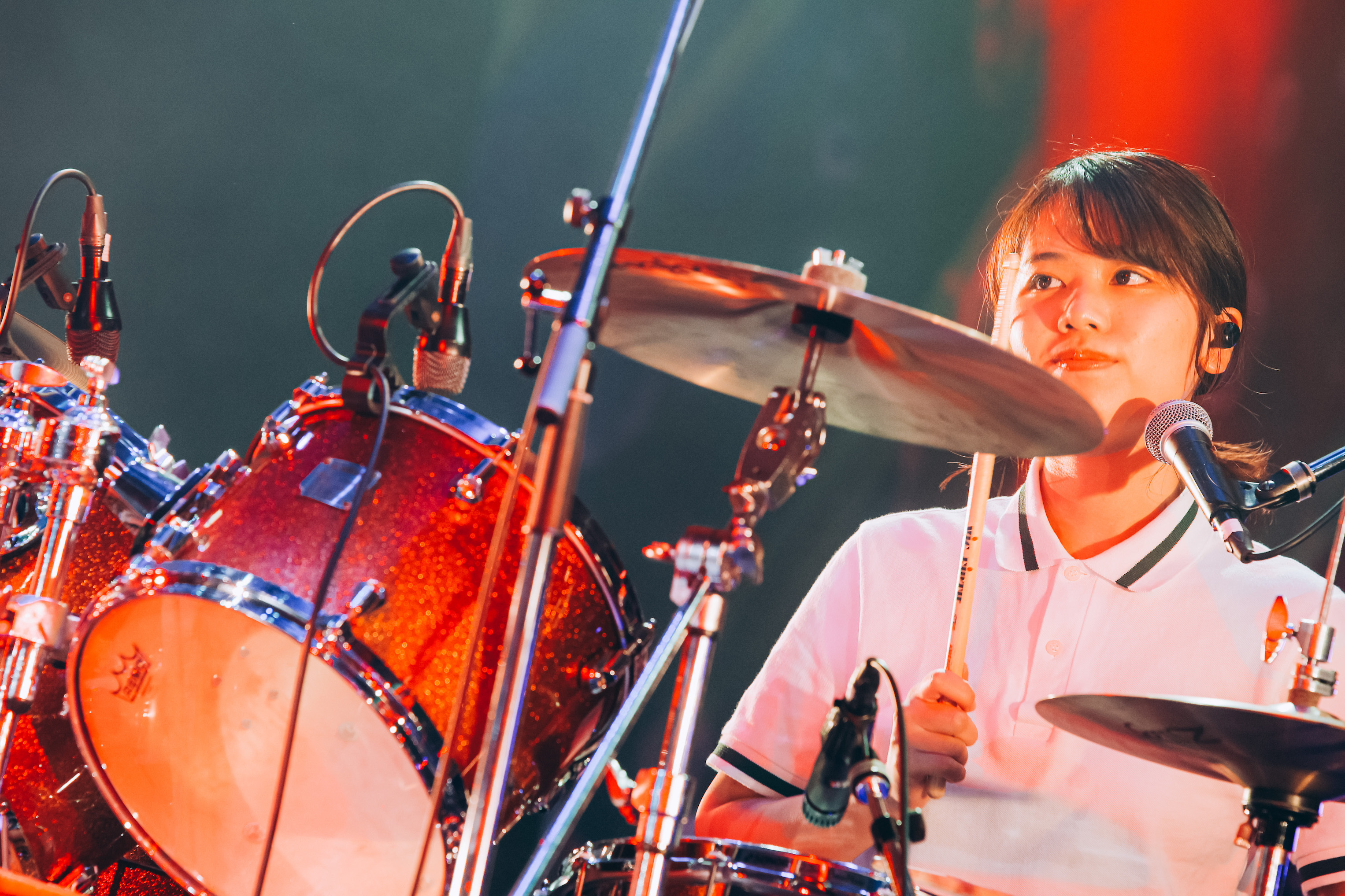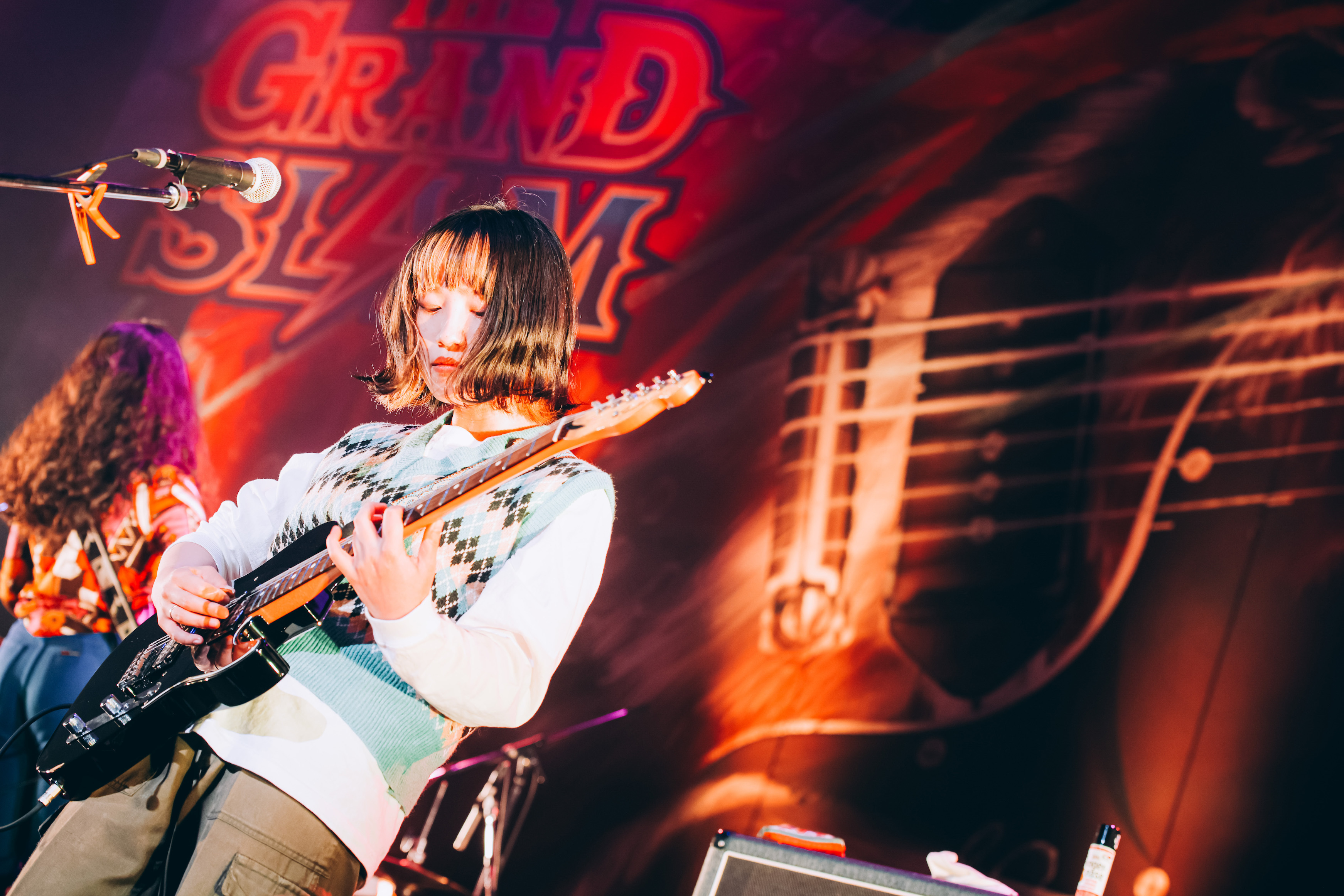 続いては現役大学生バンドのヤユヨ。初恋の嵐の「Untitled」をSEにメンバーが登場すると、会場は待ってましたの歓迎ムードに。1曲目は「星に願いを」。リコ(Vo.Gt)の凛とした歌声が伸びてゆく。堂々とした立ち振る舞いでステージを歩き回り、天真爛漫に盛り上げる。グリーンのブーツカットパンツがよく映えて華やかだ。「大阪のヤユヨです! よろしくお願いします!」とリコが挨拶し、「いい日になりそう」で勢いが加速。続いてすーちゃん(Dr.Cho)のビートが鳴り響き「Yellow wave」へ。「とにかく楽しい!」という気持ちが溢れ出すステージングに、観ているこちらもハッピーになる。