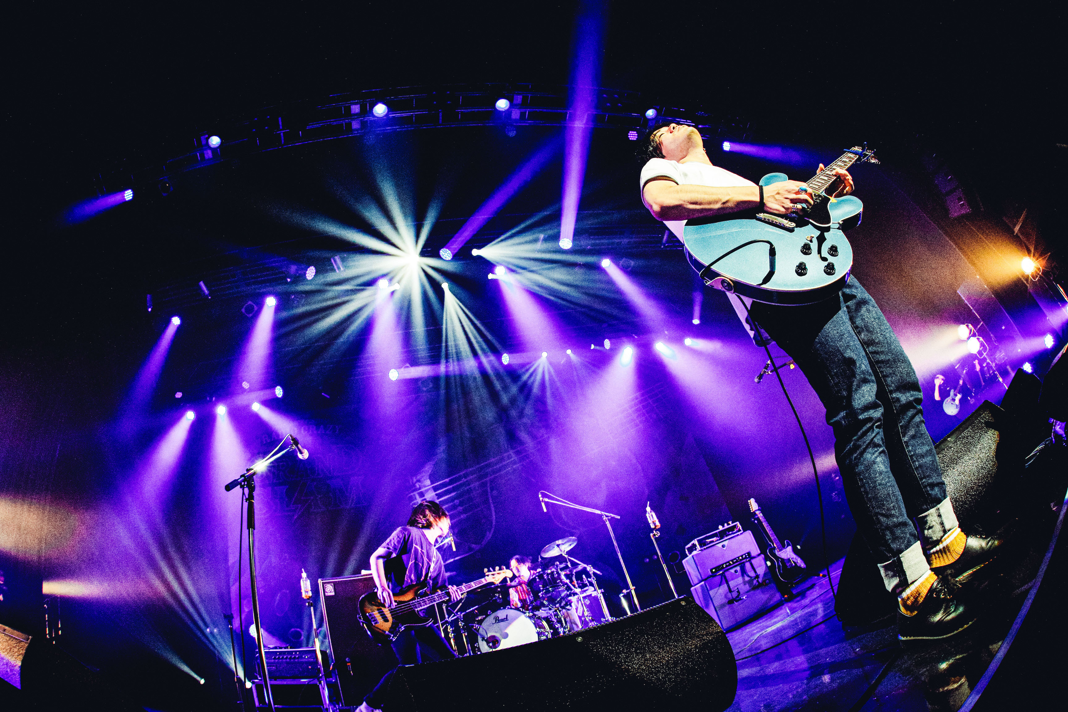 SEをバックにメンバーが登場。まずサイトウタクヤ(Vo.Gt)の歪んだギター音が聴こえ、Ken Mackay(Ba)と中島元良(Dr)がインしたと同時に、轟音が脳天を直撃する。1曲目は「モーニング・グローリー」。3人で放っているとは思えないほどの音の厚みに、問答無用で身体が刺激される。曲の繋ぎ目がわからないアレンジで間髪入れずに「Mayday」へ。会場の温度をぐんぐん引き上げる。