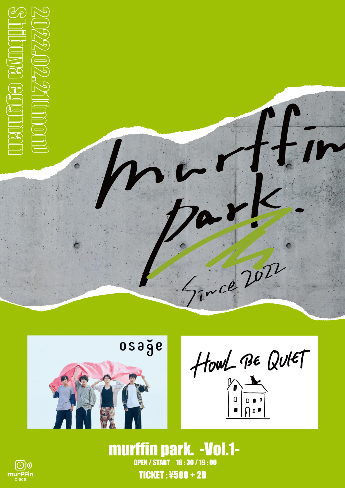2月21日に開催される記念すべき第1弾『murffin park. Vol.1』にはmurffin discsよりosage、ゲストバンドとしHOWL BE QUIETが出演する。