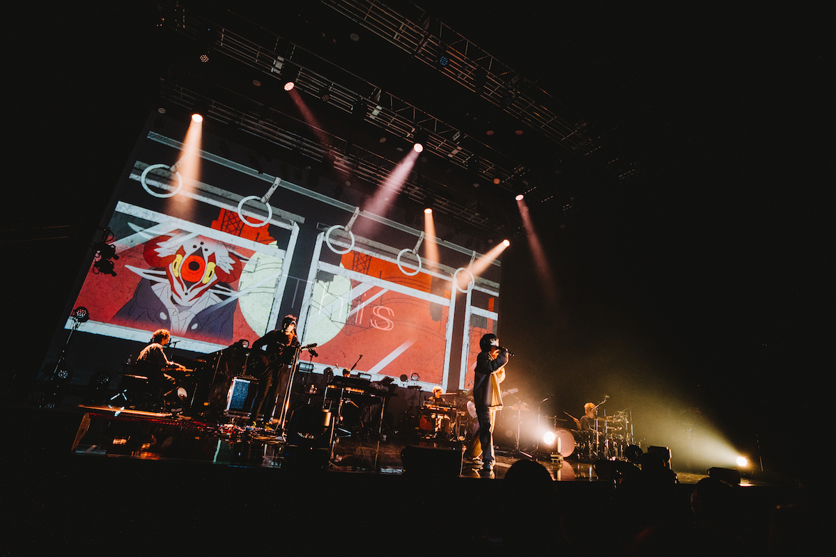 暗転し静寂が降り落ちる空間の中、ステージを覆う紗幕に幾何学的なイメージのアニメーションが映し出され、秒針のようなリズムと繊細なピアノのフレーズが静かに時を紡ぎ始める。次第に折り重なってゆく様々な音の粒子が厳かに会場を満たしたあと、一瞬の静寂を置いて映秀。の歌声がそっと光を灯すように響きわたり、ライブはスタートした。<僕が何者かは僕自身が決めるんだ>と歌うその曲は、デビューアルバムの1曲目に収録されていた「零壱匁」だ。